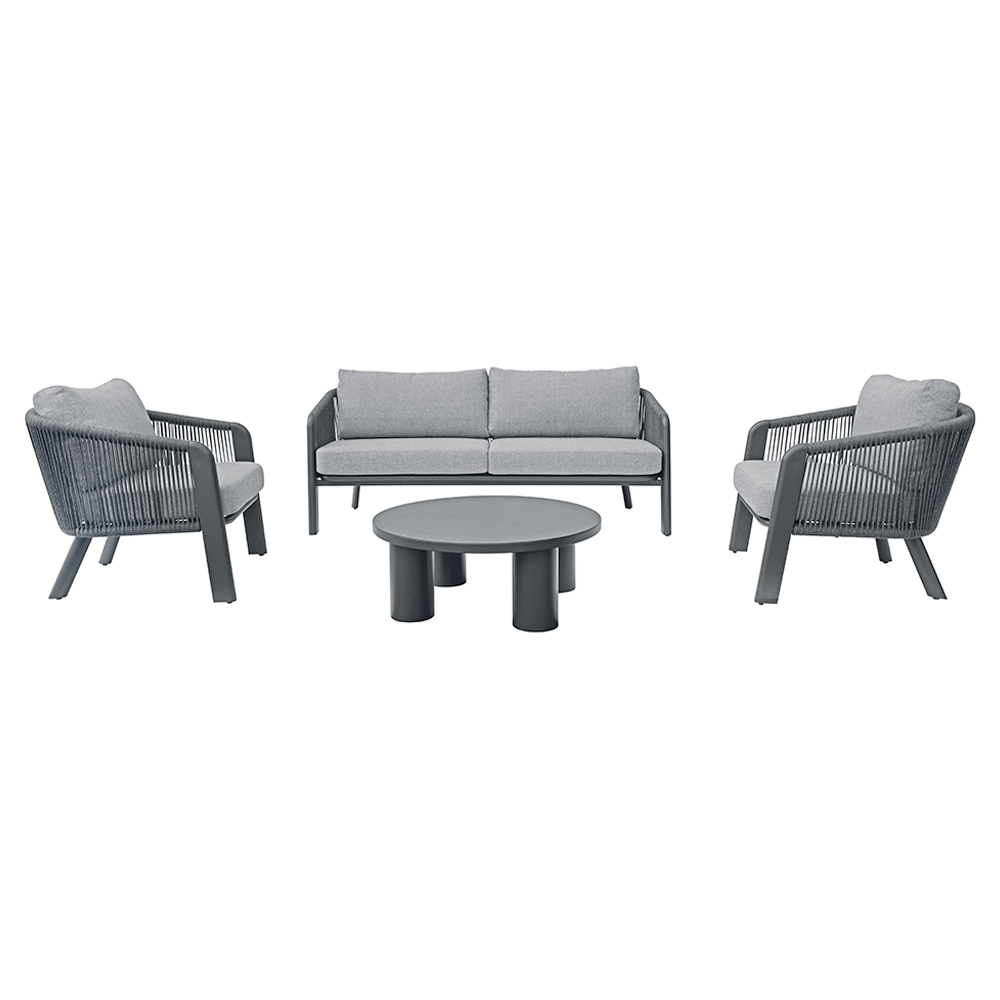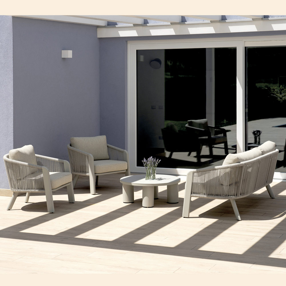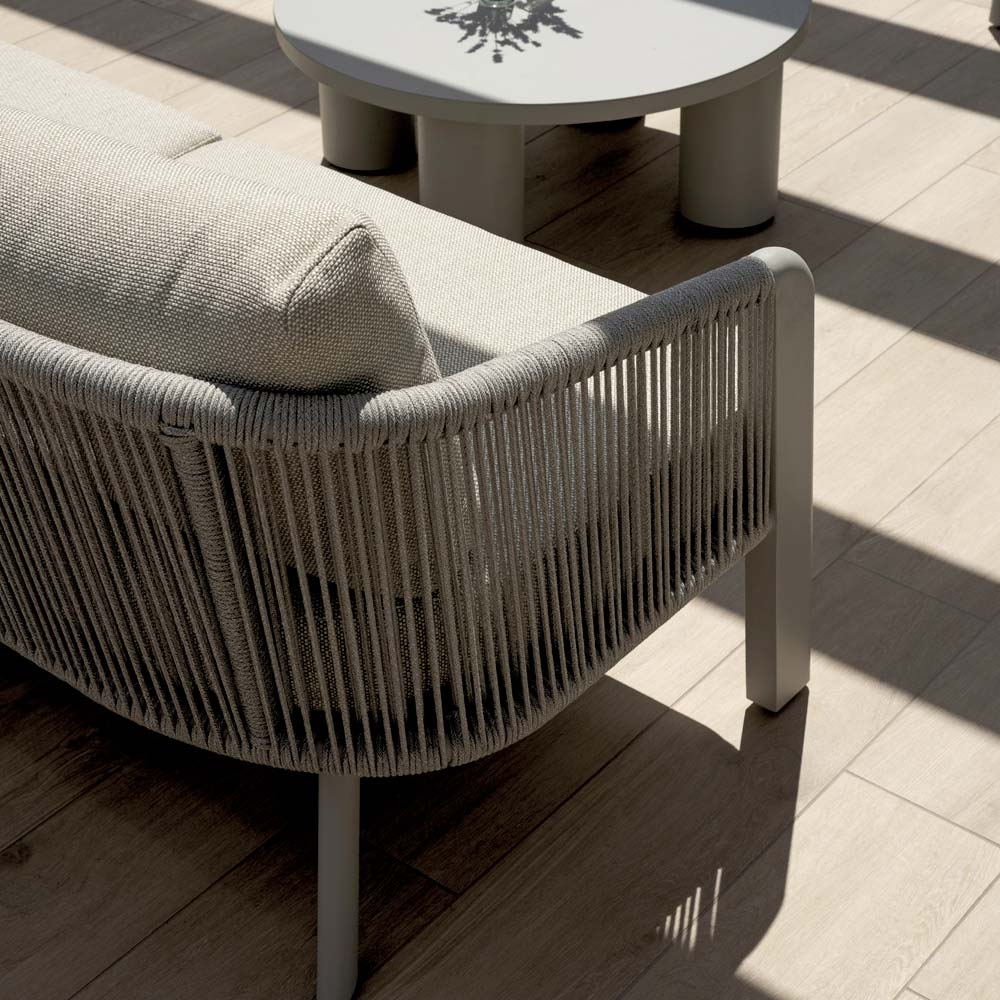 Das Aluminiumgestell sorgt für Leichtigkeit, Stabilität und Langlebigkeit, während das gewebte Seil Sitze und Rückenlehnen elegant umhüllt und so einen modernen und zugleich natürlichen optischen Effekt erzeugt. Die abnehmbaren Kissenbezüge gewährleisten maximalen Komfort und einfache Pflege und tragen dazu bei, dass das Wohnzimmer dauerhaft ein gepflegtes und stilvolles Erscheinungsbild behält.