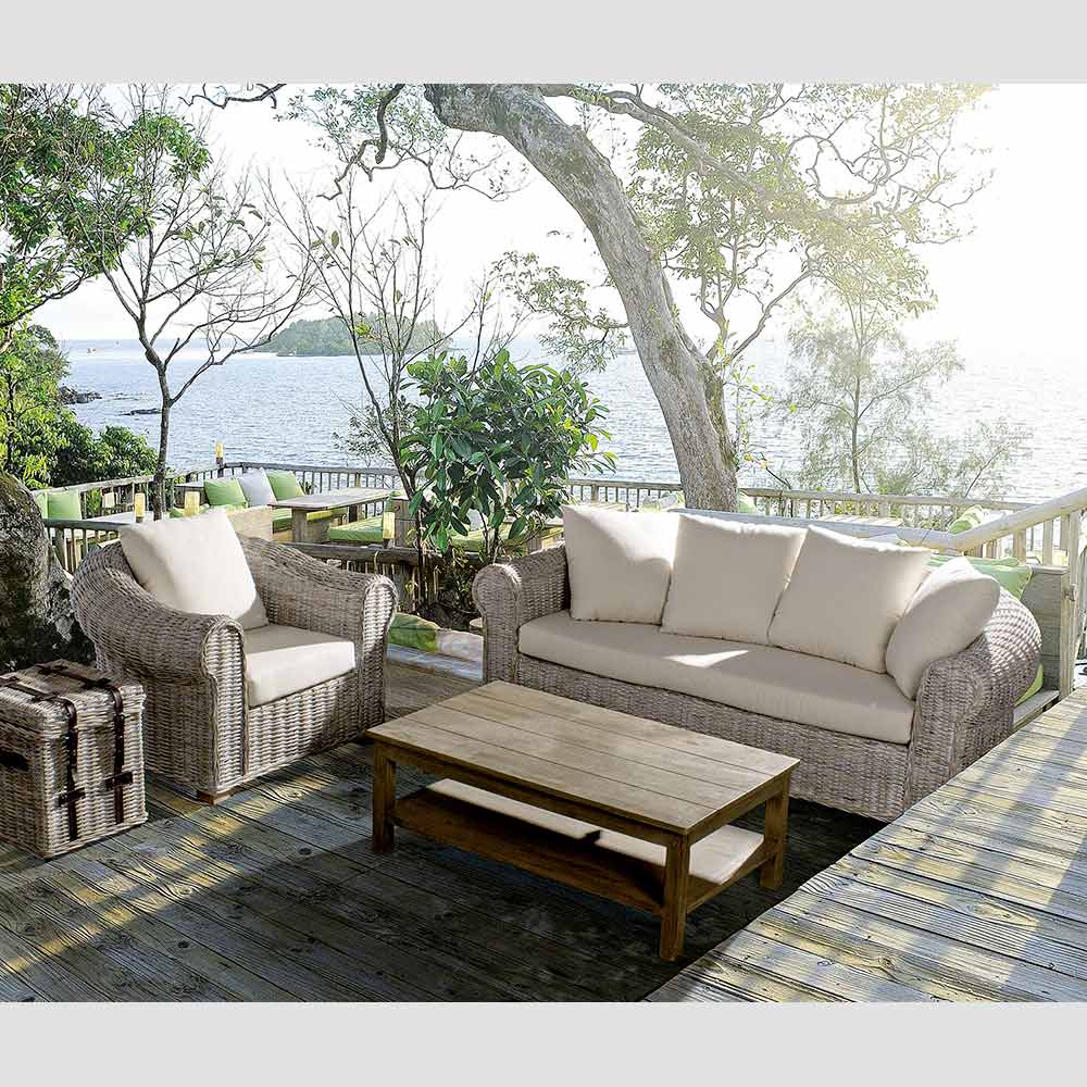 Rattanstruktur, Kubu-Webart, Nitrocellulose-Finish. Mango Holzfüße. Kissen mit abnehmbaren Bezügen für den Innenbereich (Leinen).