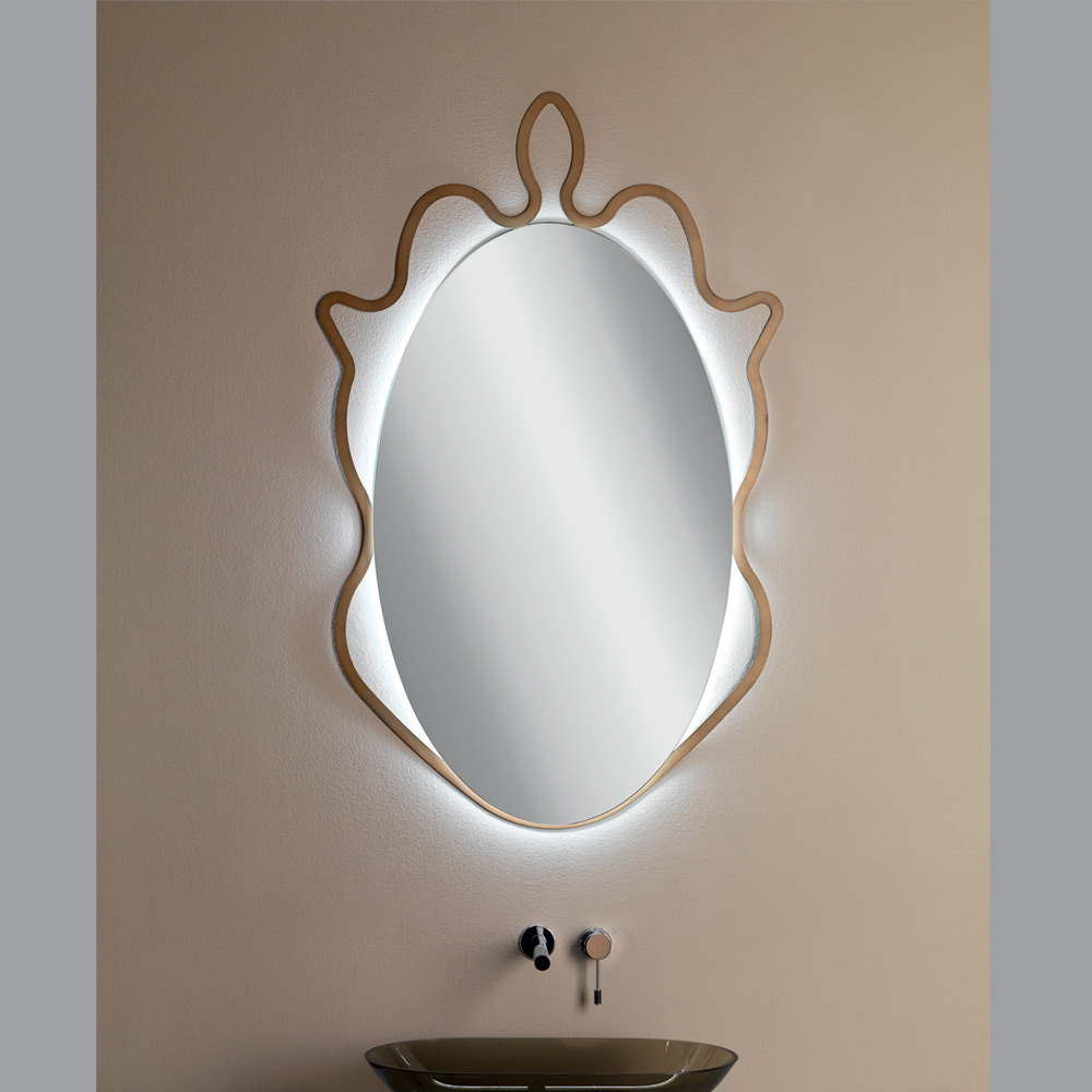 Dieser italienische Kunsthandwerksspiegel ist die Quintessenz funktionaler Eleganz , eine Hommage an die Meisterschaft des Designs, das jeden Raum mit seiner Präsenz aufwertet. Sein geschwungenes und organisches Profil, das die weichen Formen der Natur widerspiegelt, wird von einer raffinierten Kontur aus Edelmetall umrahmt, die es in ein wahres Kunstwerk verwandelt.
