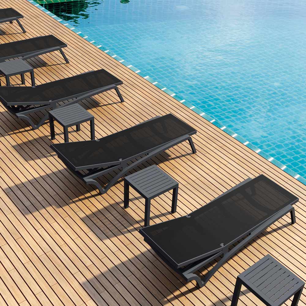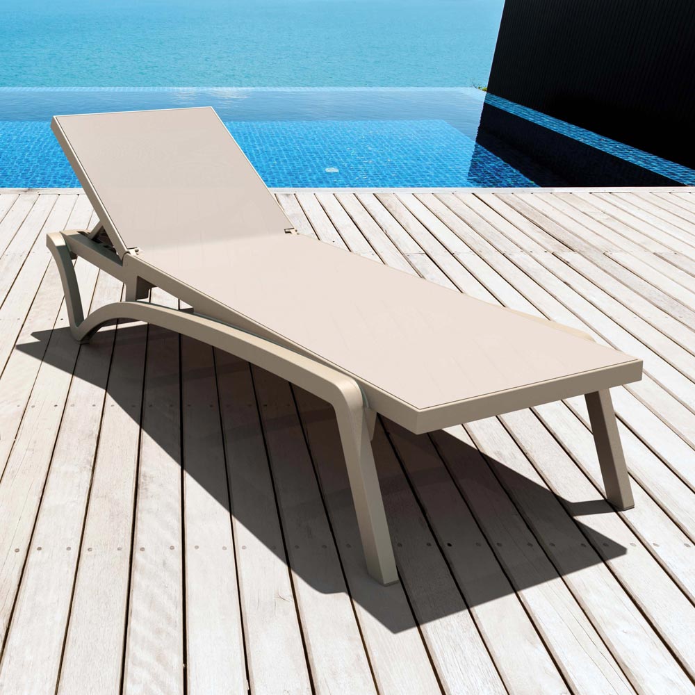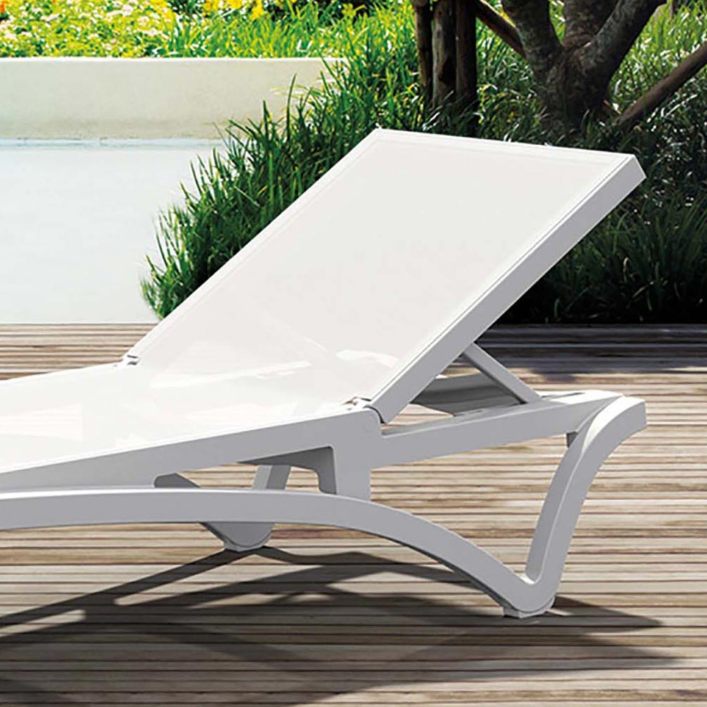 Outdoor-Sonnenliege mit Polypropylen- Rahmen kombiniert mit farbigem Textilene-Netz mit verstellbarer Rückenlehne in bis zu 5 Positionen, rutschfesten Füßen und Rädern.