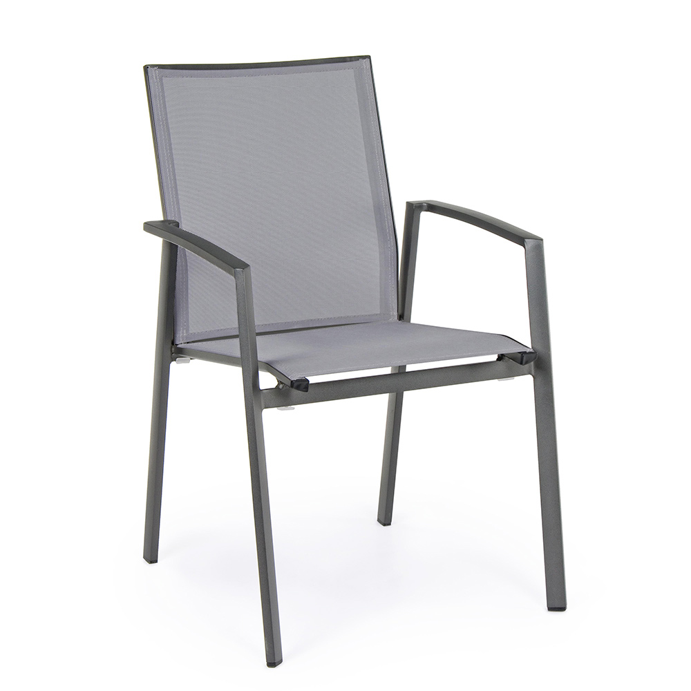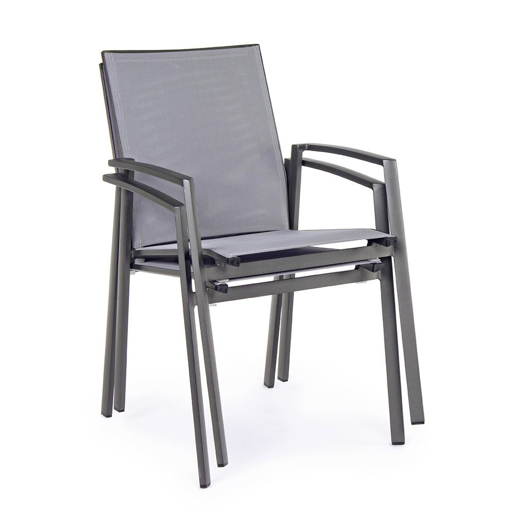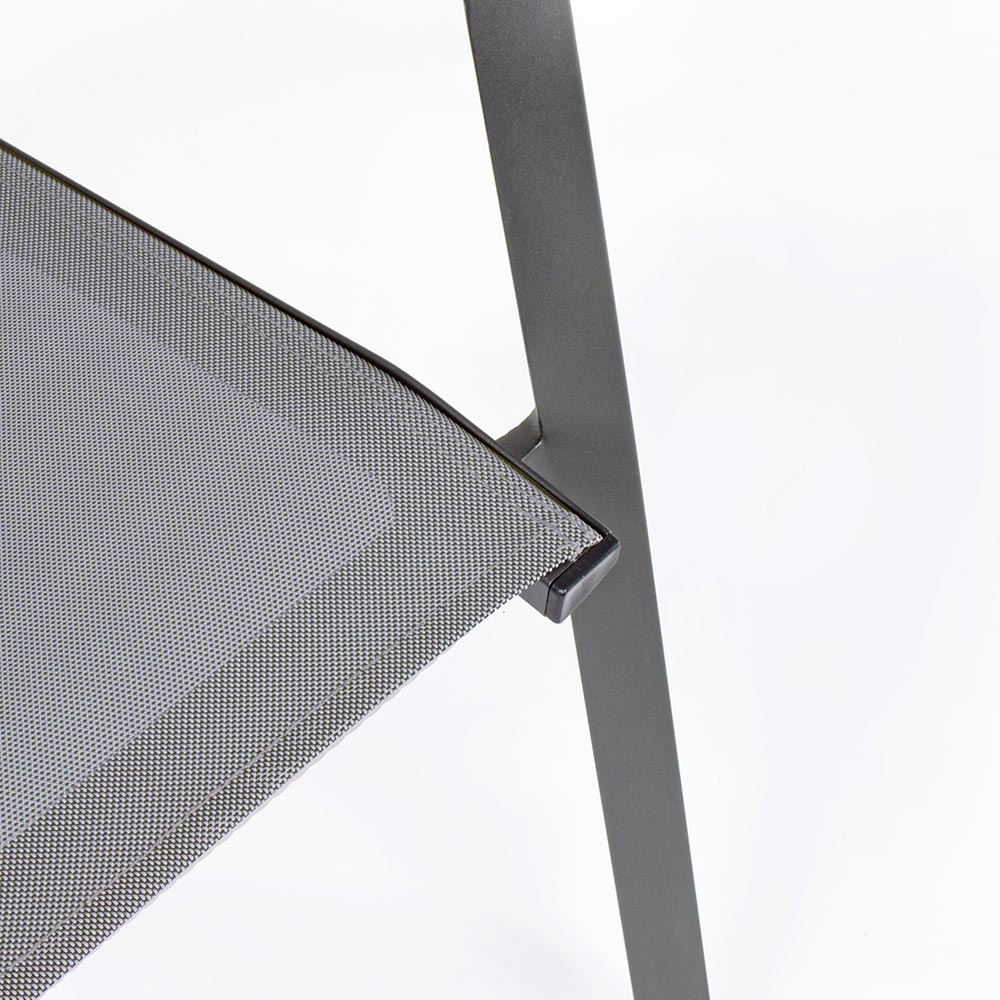 Pulverbeschichtete Aluminiumstruktur (Polyester). Sitz und Rückenlehne mit 1x1 Phifer Textilene bezogen. Stapelbar.