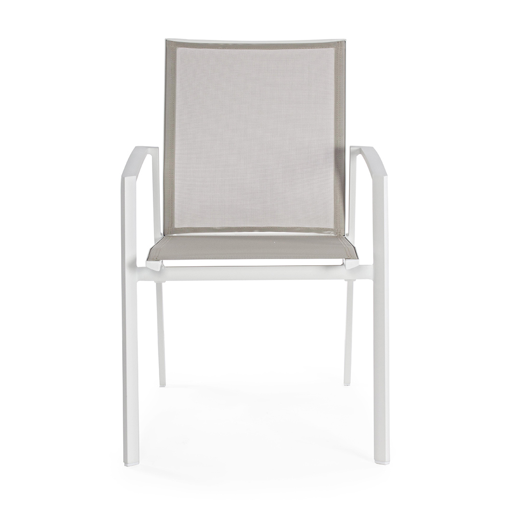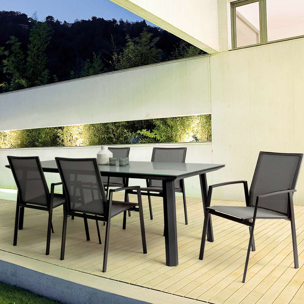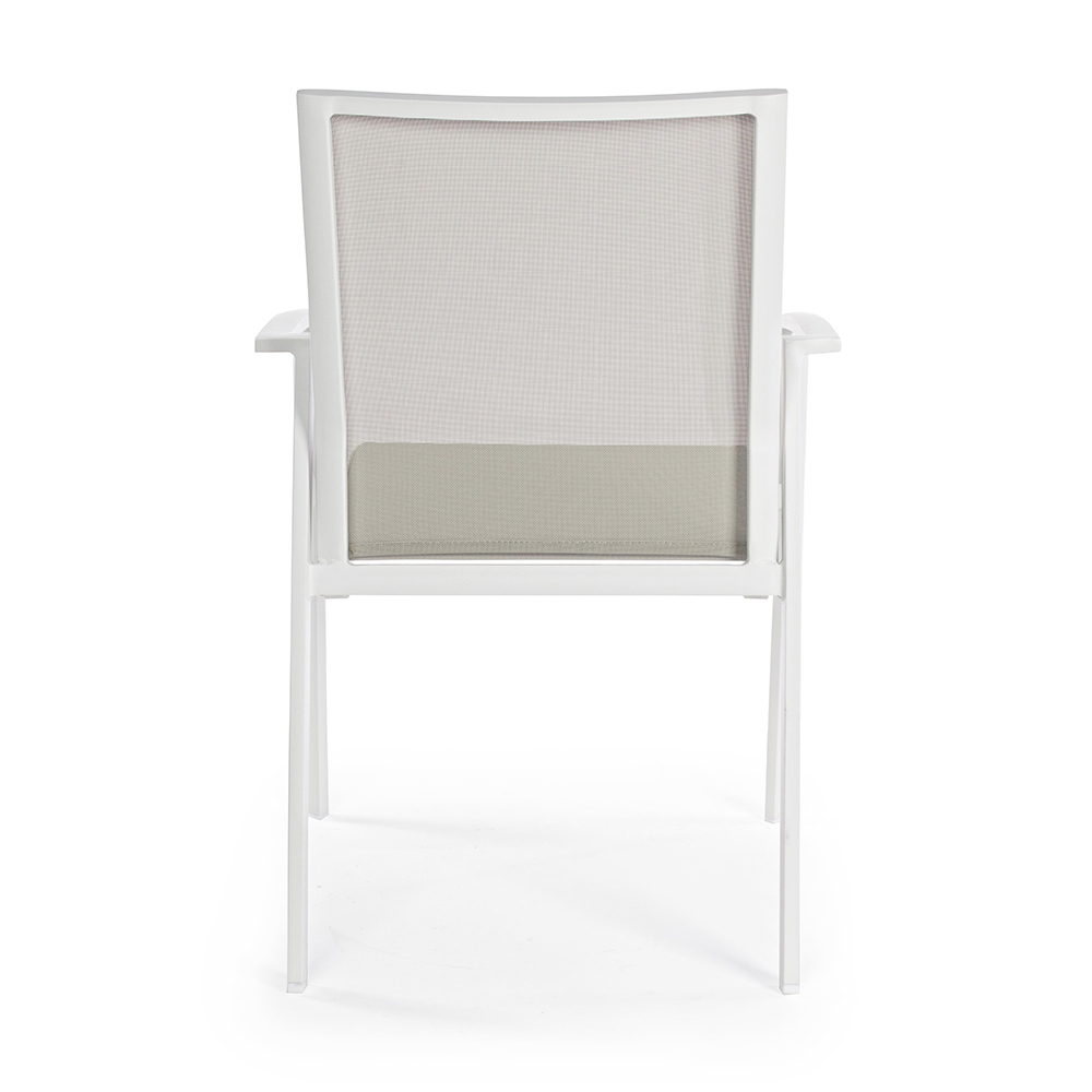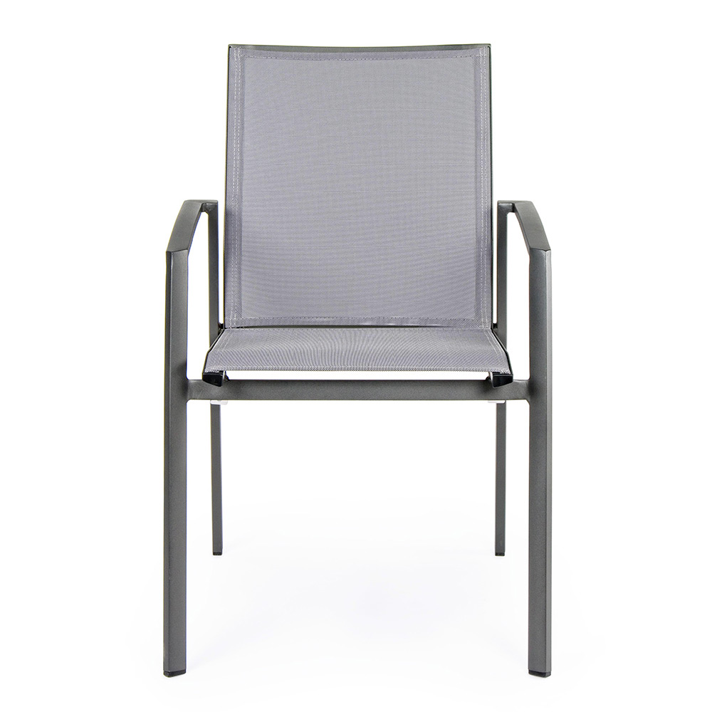 Pulverbeschichtete Aluminiumstruktur (Polyester). Sitz und Rückenlehne mit 1x1 Phifer Textilene bezogen. Stapelbar.