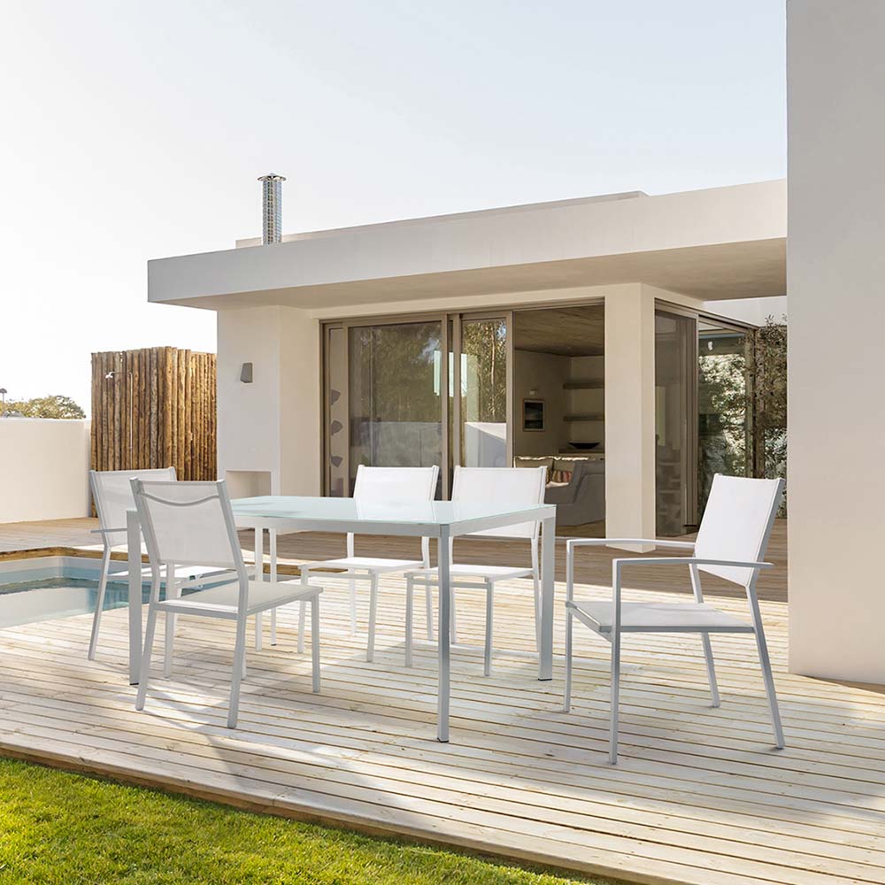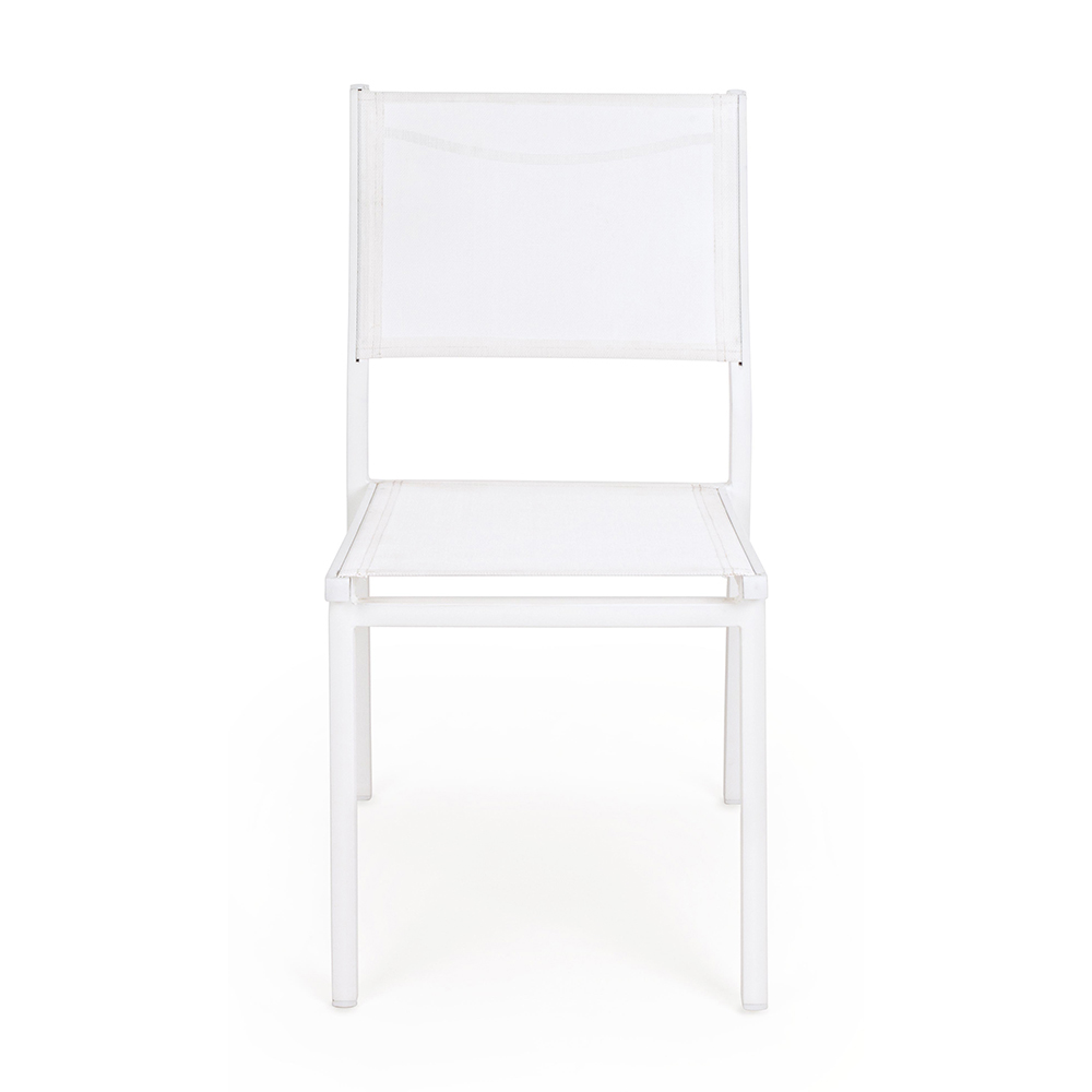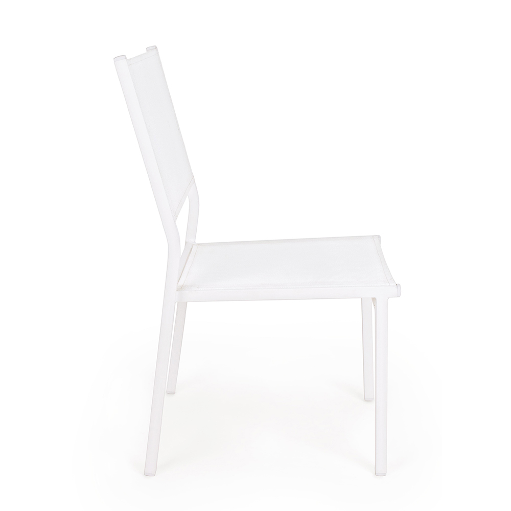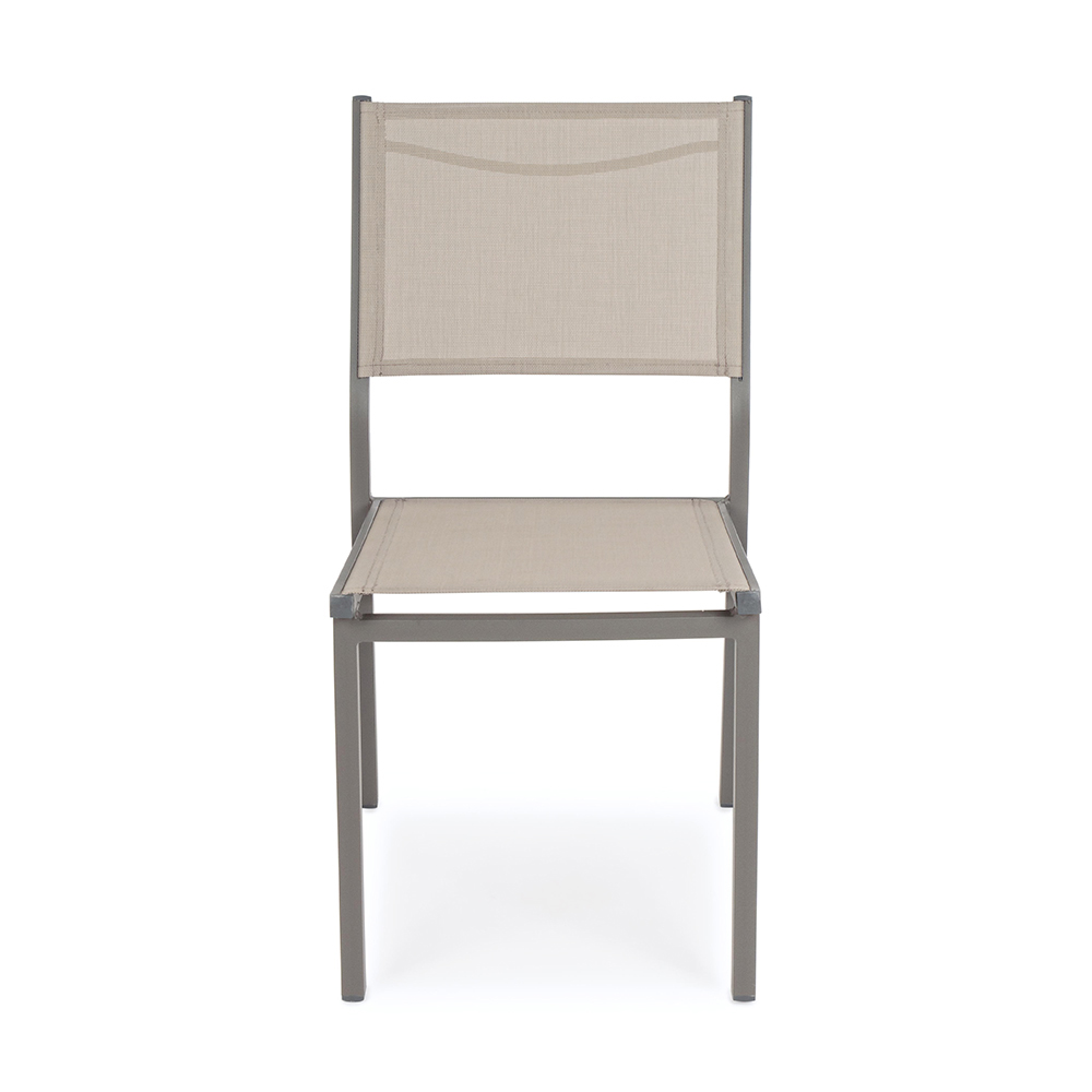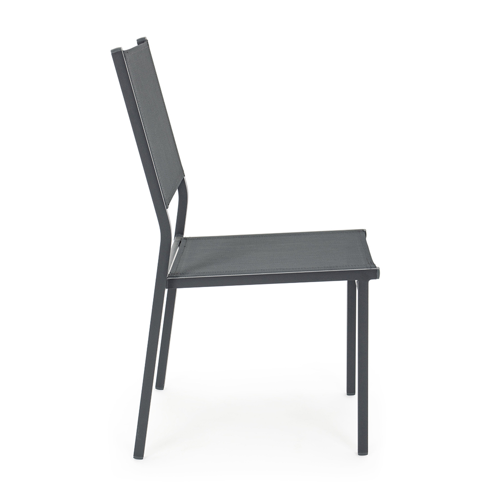 Moderner stapelbarer Gartenstuhl aus Aluminium und Textilien, Outdoor-Artikel.