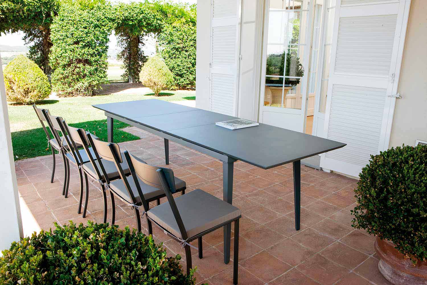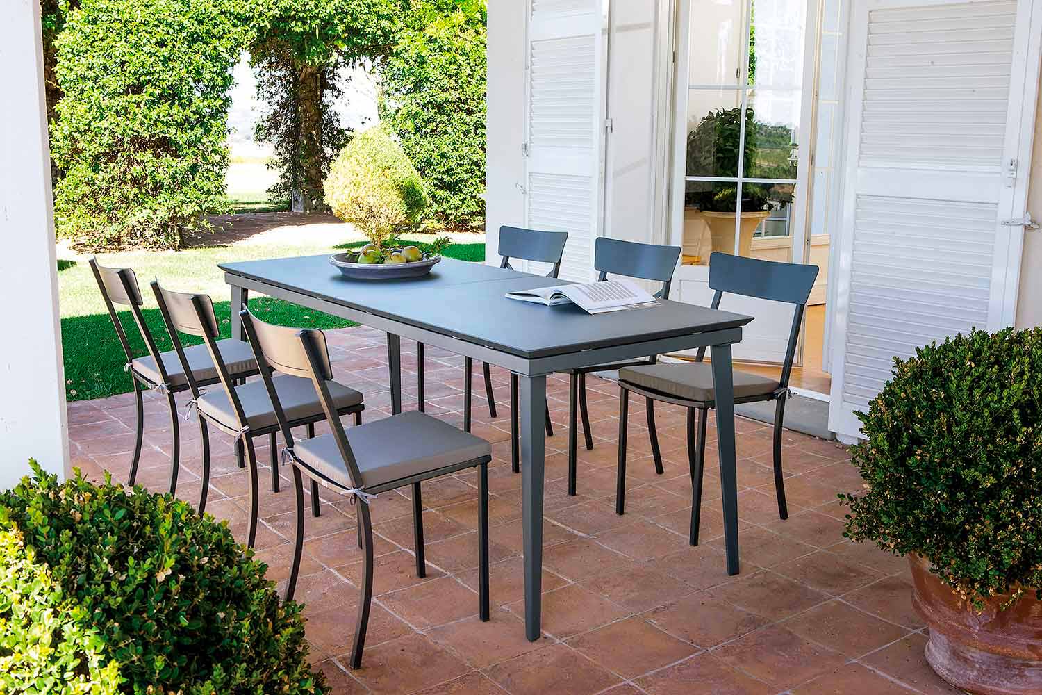 Diese Outdoor-Produktlinie vereint dank hochwertiger Materialien und innovativer Techniken eine beeindruckende Optik mit minimalistischem Design und schlichten, leichten Linien. Die verwendeten Materialien und Techniken, kombiniert mit der Stärke des Made in Italy, verleihen jedem Produkt eine hervorragende Langlebigkeit und perfekte Witterungsbeständigkeit. Dank der filigranen Formen und des Stils, die diese Produktlinie auszeichnen, eignet sie sich für die unterschiedlichsten Umgebungen, von privaten Bereichen wie Gärten und Terrassen bis hin zu Objektbereichen wie Bars und Restaurants.