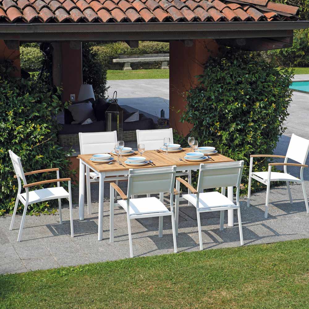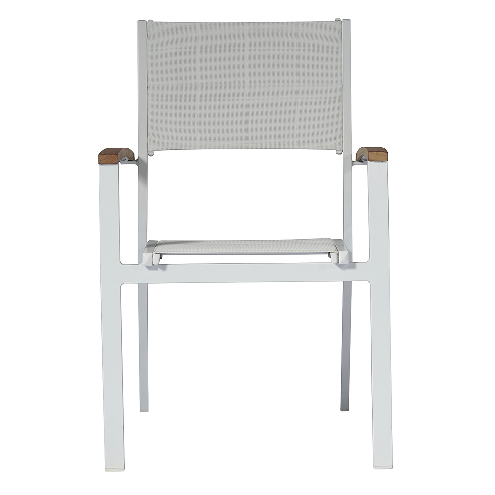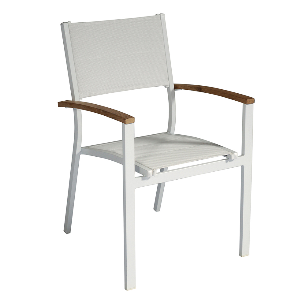 Stapelbarer Outdoor-Stuhl mit Struktur aus Aluminium und Sitz aus elfenbeinfarbenem, gepolstertemTextilene , angereichert mit eleganten Armlehnen aus Teakholz . Dieser Outdoor-Stuhl vereint Design und Einfachheit , das Ergebnis einfacher, aber widerstandsfähiger Materialien , die einem Produkt mit einem originellen und avantgardistischen Design Leben einhauchen, das sich perfekt für jede Umgebung eignet.