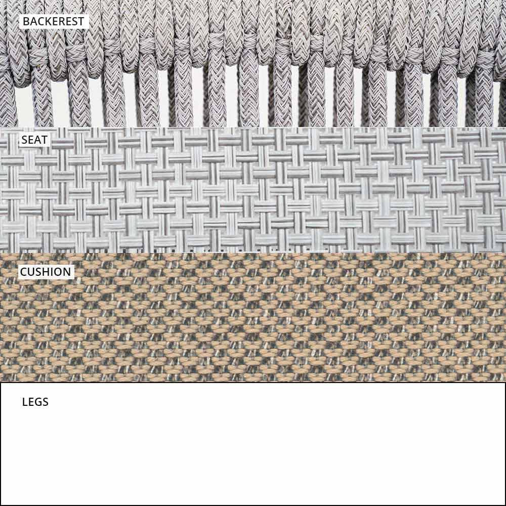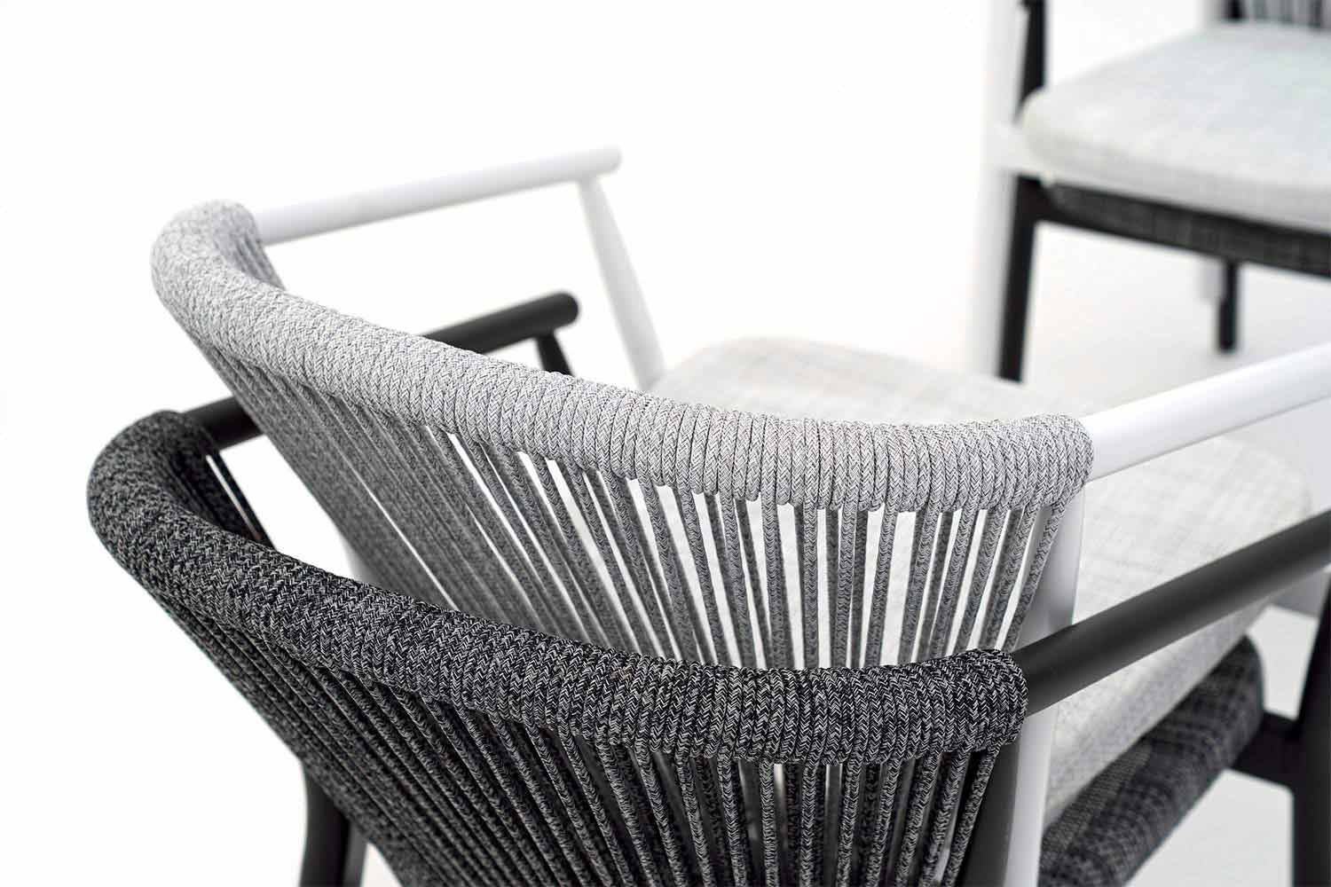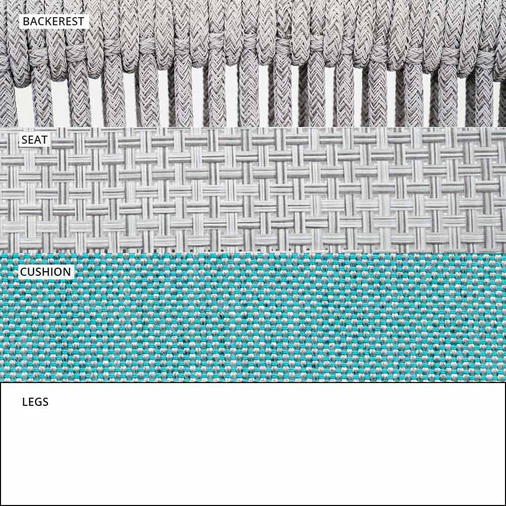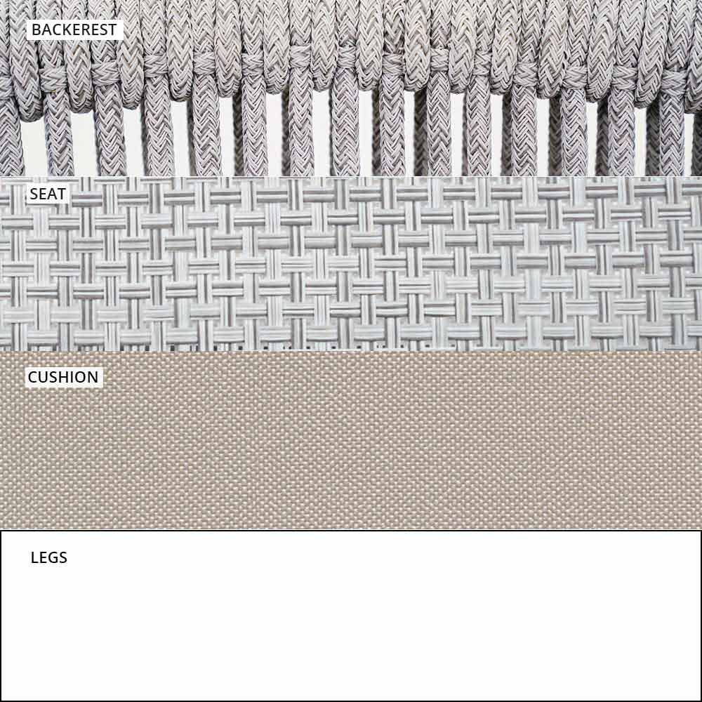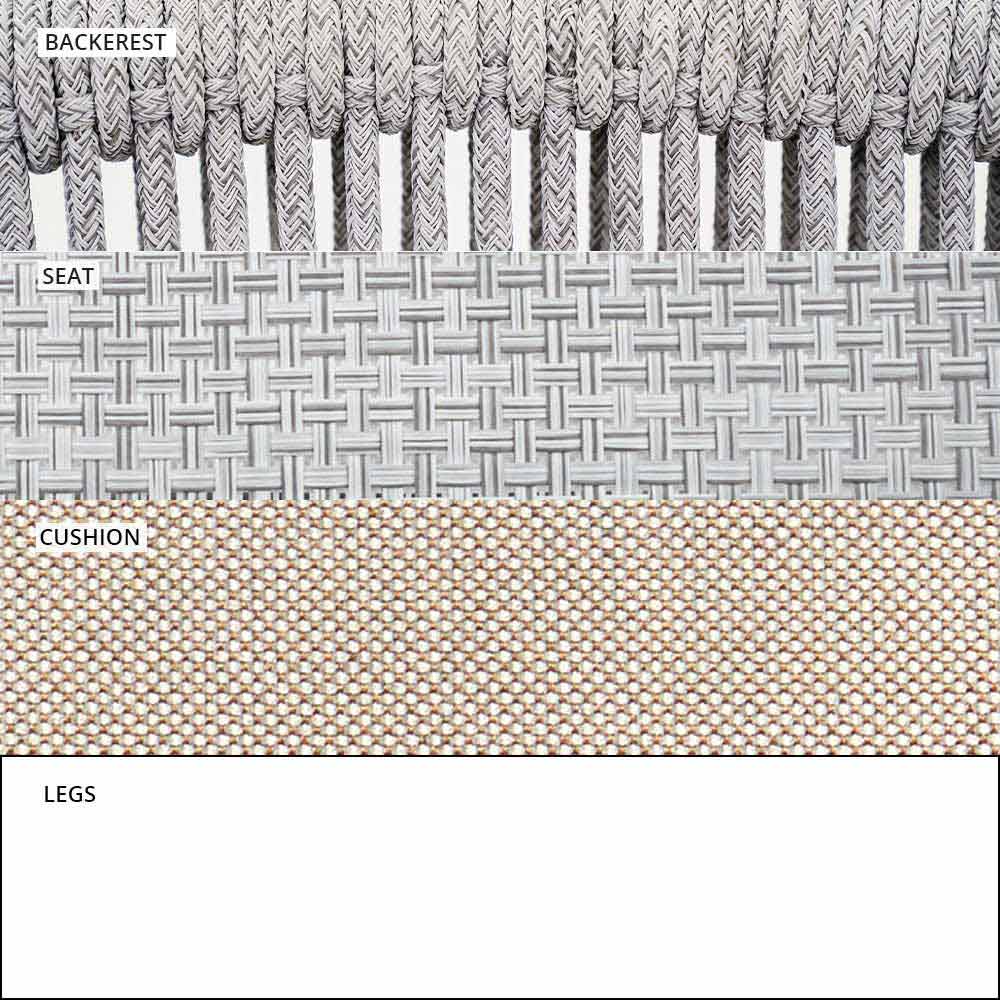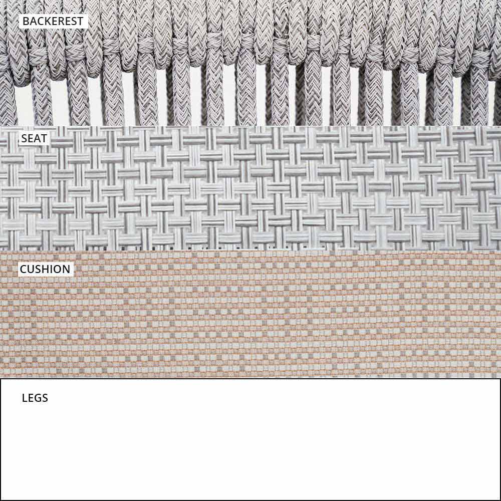 Smart wurde mit einer weißen pulverbeschichteten Aluminiumstruktur hergestellt , Sitz aus weißem VAR # TEX-Stoff und Rücken aus weißer VAR # TEX-Kunststoffschnur .