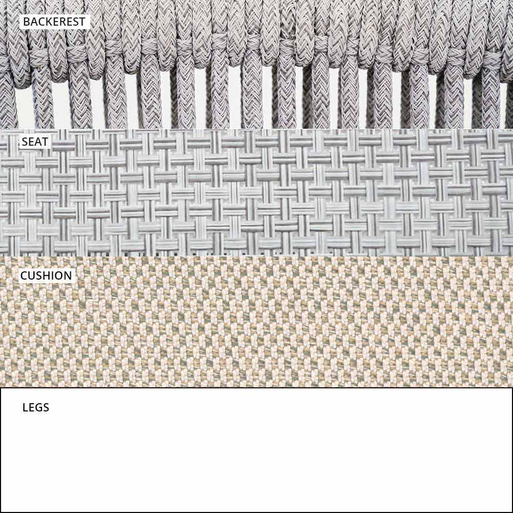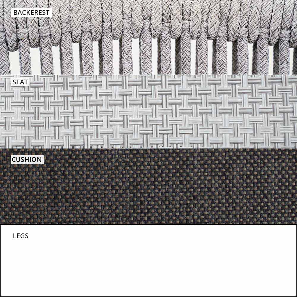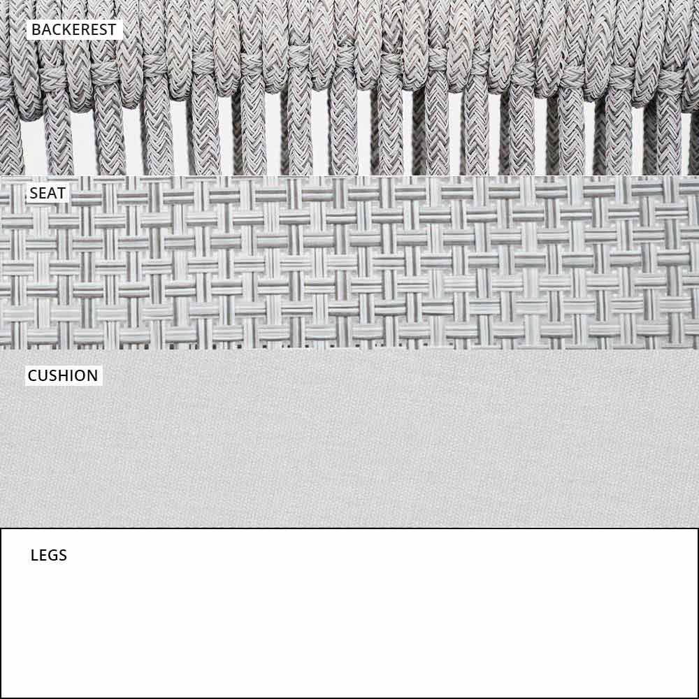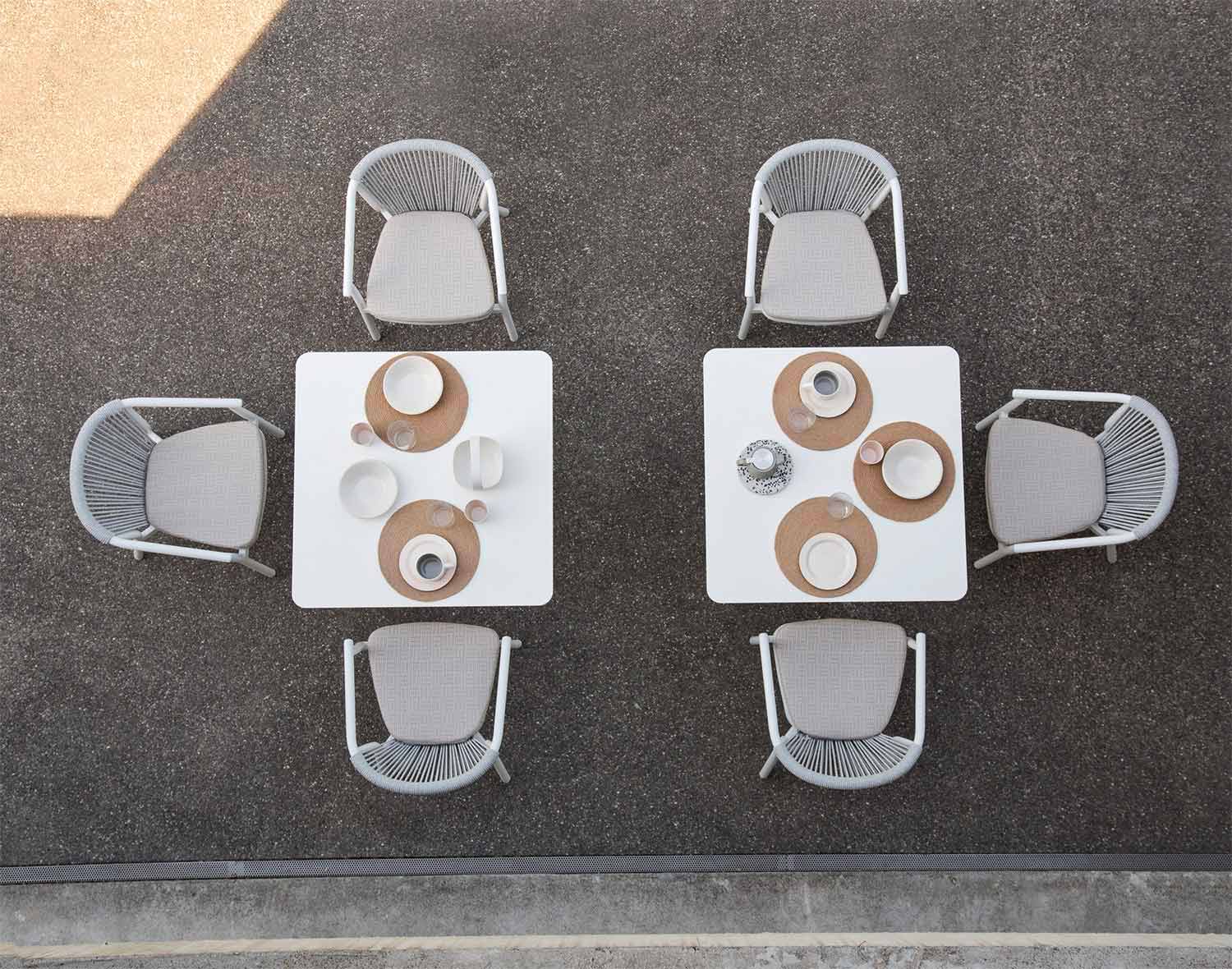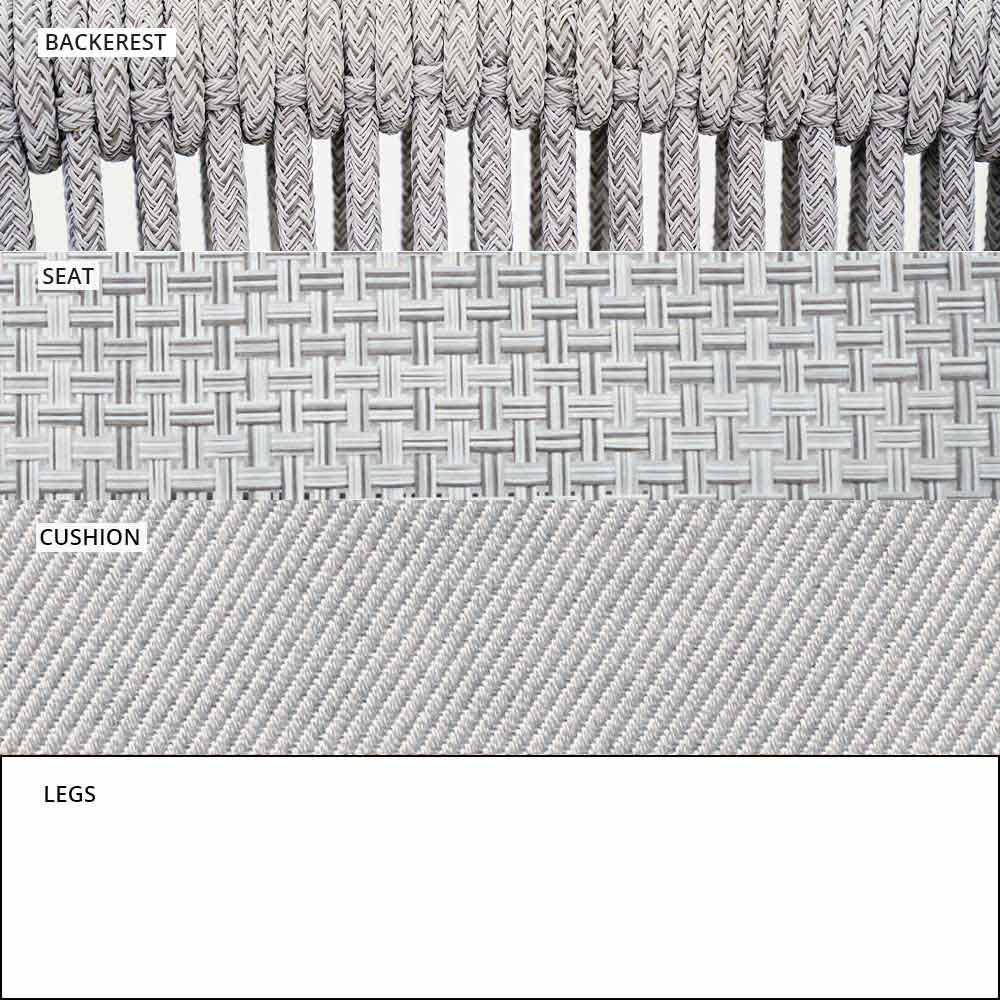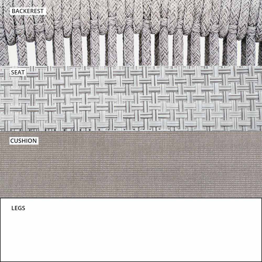 Smart wurde mit einer weißen pulverbeschichteten Aluminiumstruktur hergestellt , Sitz aus weißem VAR # TEX-Stoff und Rücken aus weißer VAR # TEX-Kunststoffschnur .