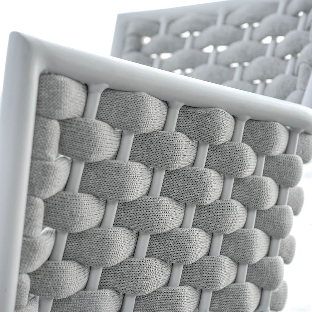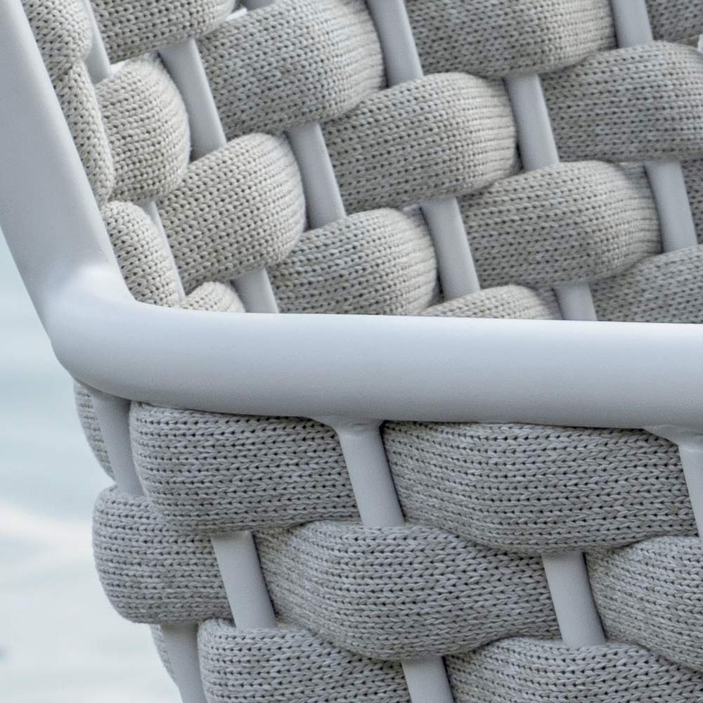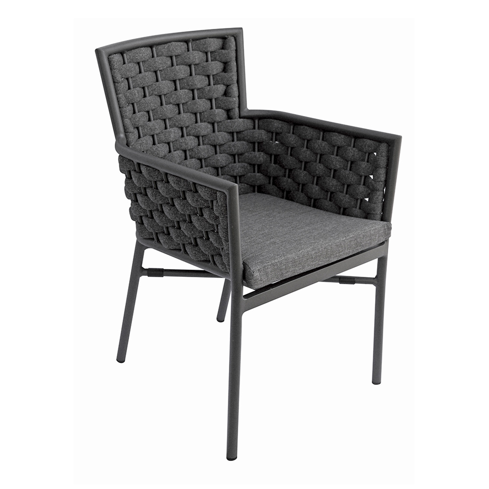 Raffinesse und Komfort treffen sich in diesem Außenstuhl mit einem modernen und gemütlichen Design. Die weiche und strapazierfähige geflochtene Seilrückenlehne und die Armlehnen verleihen dem Stuhl einen Hauch von handwerklicher Eleganz, während die Polsterung höchsten Komfort bietet, ideal für entspannte Momente im Freien.