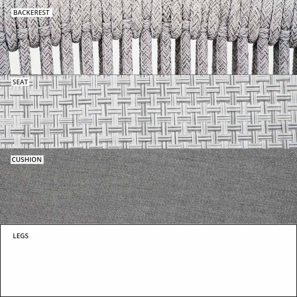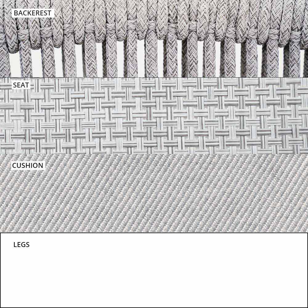 Smart wurde mit einer weißen pulverbeschichteten Aluminiumstruktur hergestellt , Sitz aus weißem VAR # TEX-Stoff und Rücken aus weißer VAR # TEX-Kunststoffschnur .