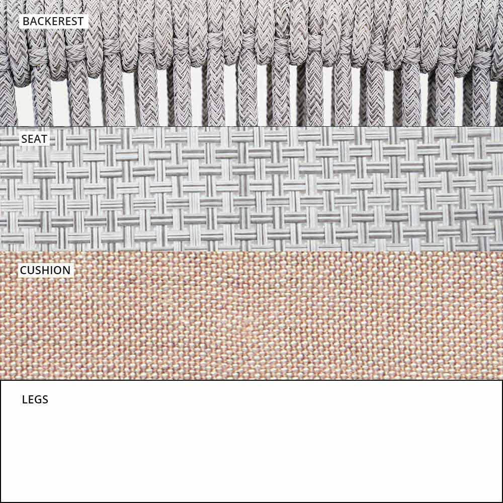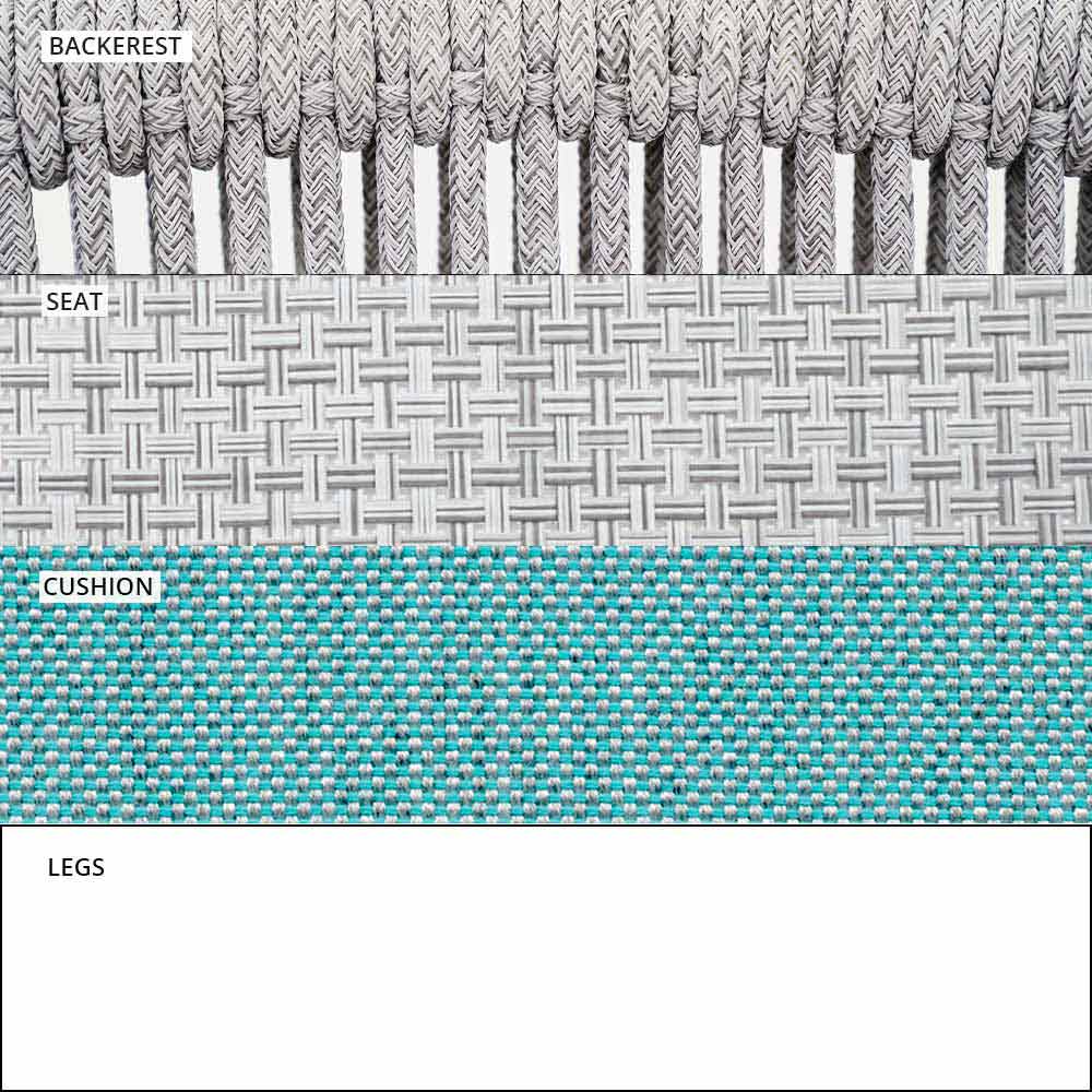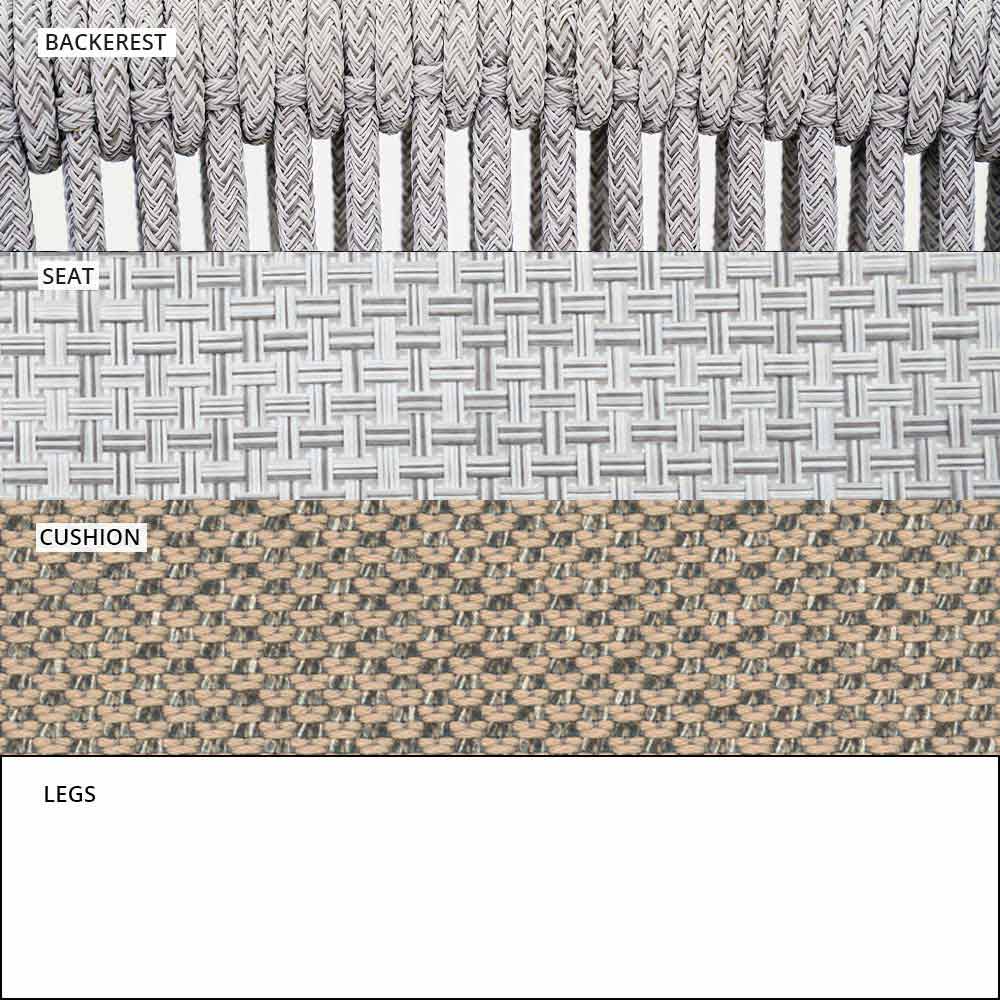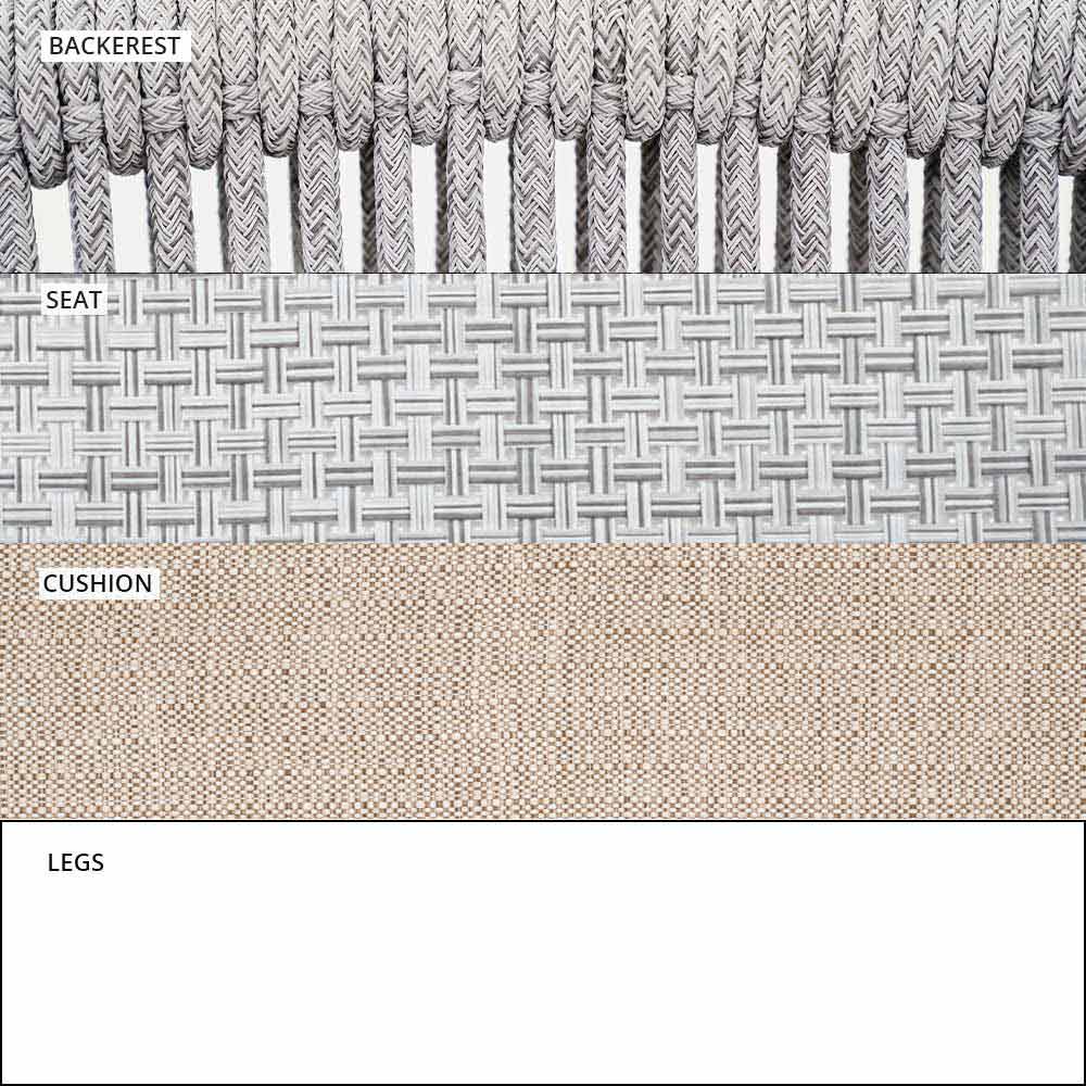 Die Verflechtung der Rückenlehne mit synthetischer Kordel VAR # TEX verbessert die Ästhetik dieses Sofas, das für Tage im Freien in Gesellschaft konzipiert wurde.