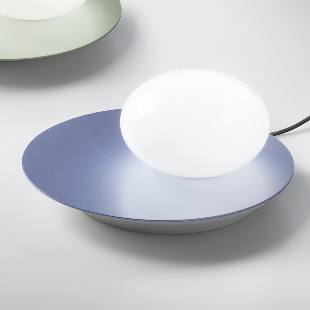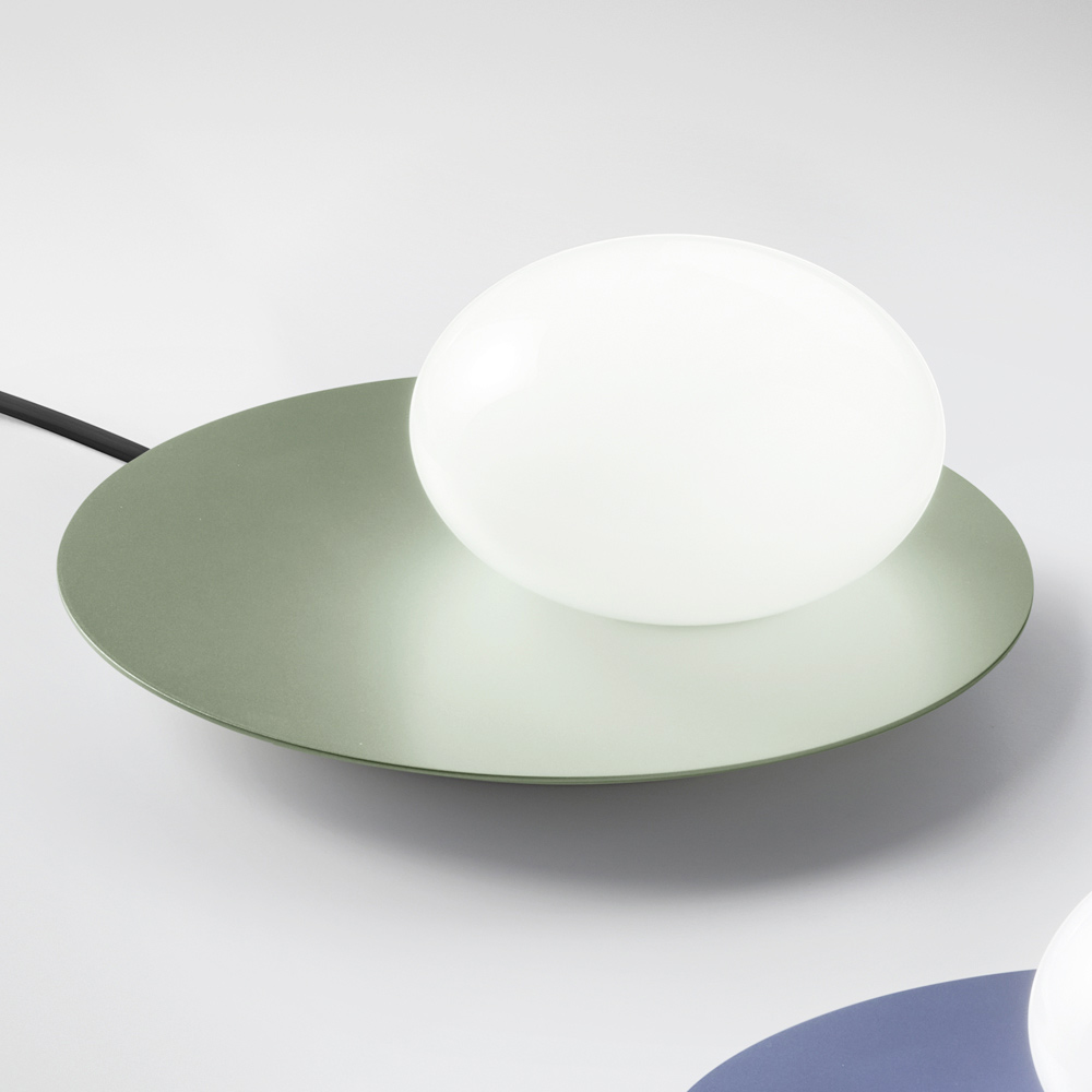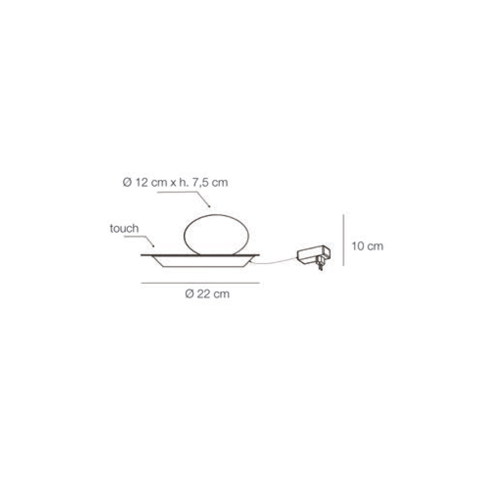 Innenleuchte mit einem Rahmen aus recycelbarem Aluminium, einer Deckenrosette aus Metall und einem Lampenschirm aus milchig-weißem geblasenem Glas. Die Leuchte ist über einen Berührungssensor in der Deckenrosette dimmbar.