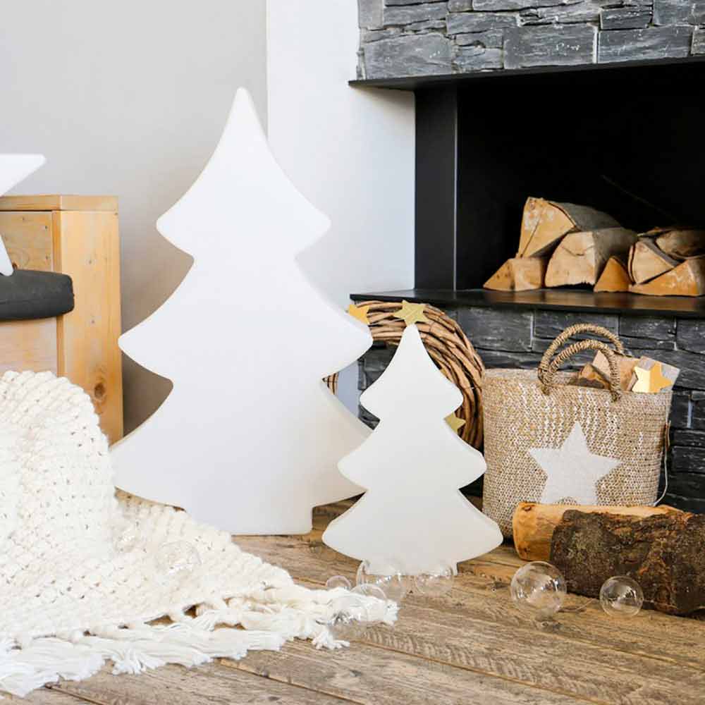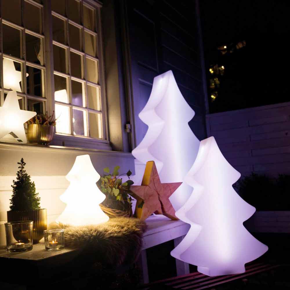 Diese Tisch- oder Stehlampe für drinnen oder draußen zeichnet sich durch ihr faszinierendes Design in Form eines Tannenbaums aus, der in drei Größen erhältlich ist, um Weihnachten zu symbolisieren und eine einladende und festliche Atmosphäre zu schaffen.