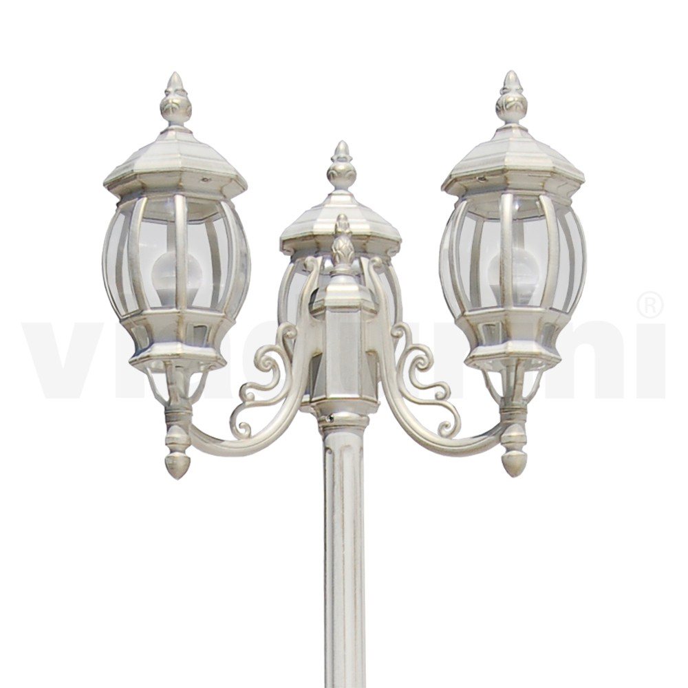 3-flammige Straßenlaterne aus Aluminiumdruckguss mit transparentem Polycarbonat- Diffusor , 100 % Made in Italy . Komplett mit Edelstahlschrauben. Ein Vintage- und romantischer Stil , der perfekt zu den wunderbaren angebotenen Oberflächen passt und ein elegantes Ergebnis mit starker Persönlichkeit schafft, das durch die wunderbaren Details, die die gesamte Struktur charakterisieren, bereichert und einzigartig gemacht wird. Ideal für Außenbereiche wie Gärten, Alleen, Gehwege oder Außenflächen wie Bars und Restaurants.