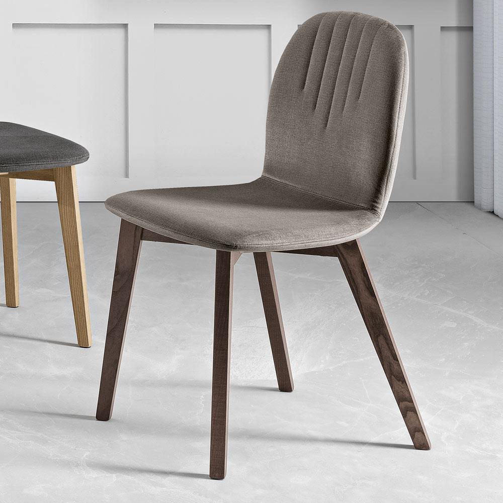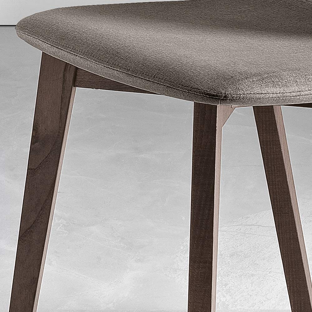 Dieser Stuhl kombiniert auf elegante Weise den Farbton des Holzes seiner Beine mit der Farbe des Stoffsitzes. Das moderne, stromlinienförmige Design der Rückenlehne, verziert mit einem zarten linearen Muster , verleiht einen Hauch von Klasse, der jeden Esstisch oder Arbeitsplatz sofort aufwertet.