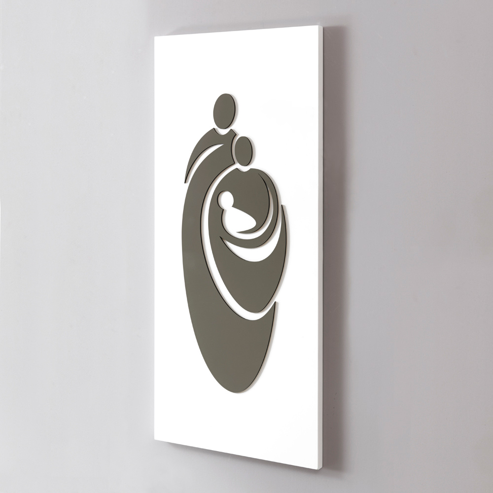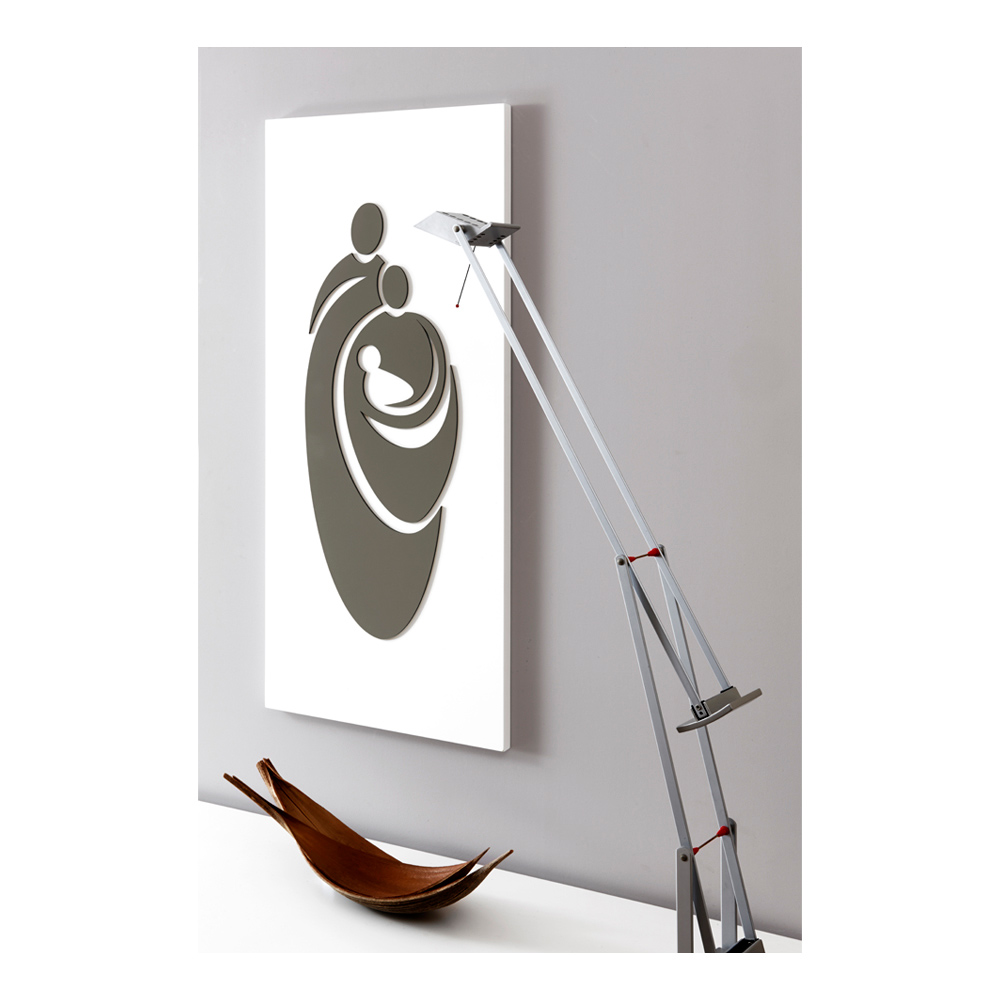 Sakraler Rahmen aus weiß lackiertem Holz mit taubengrau lackierter Holzapplikation der stilisierten Heiligen Familie .