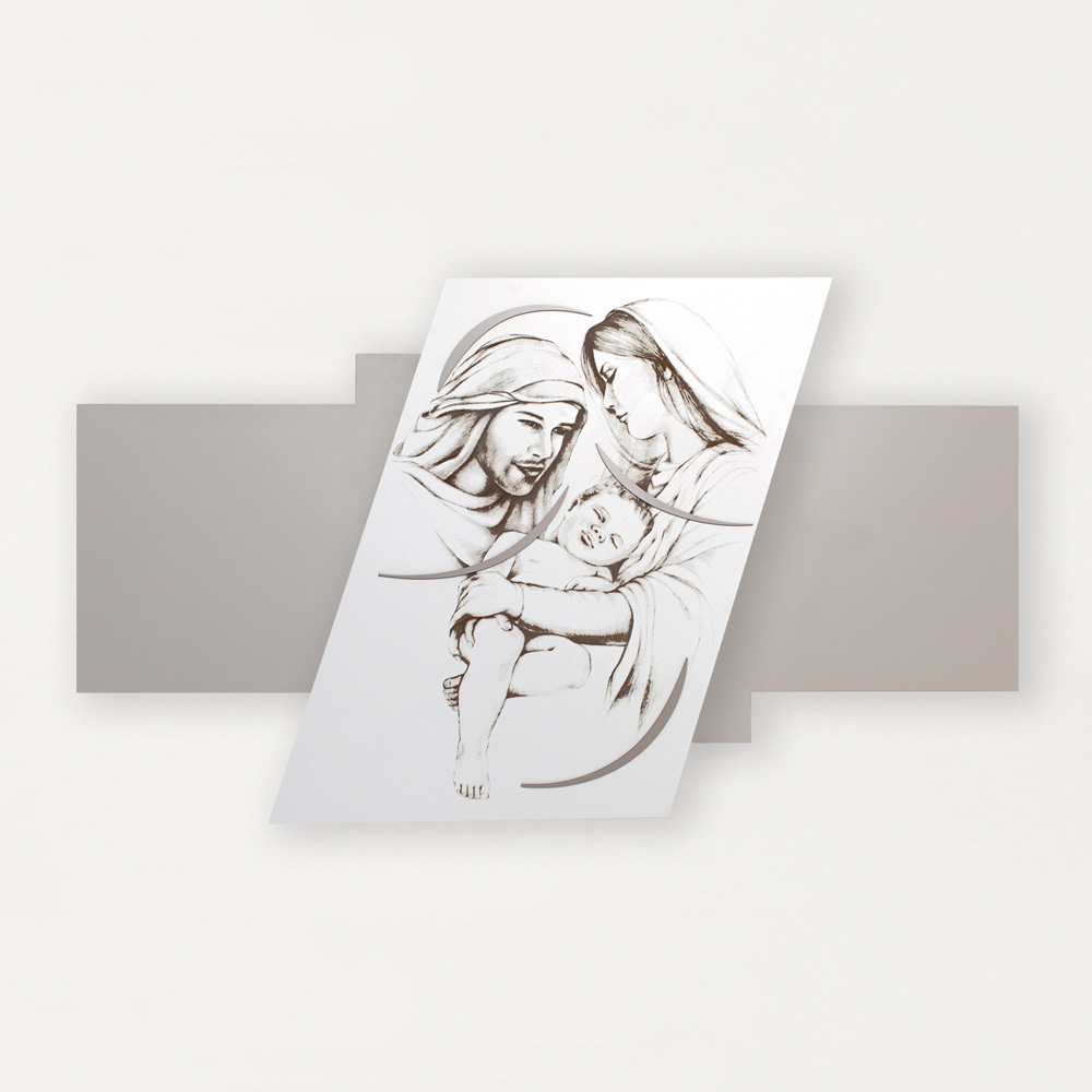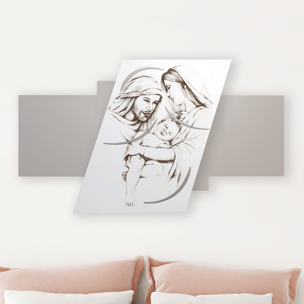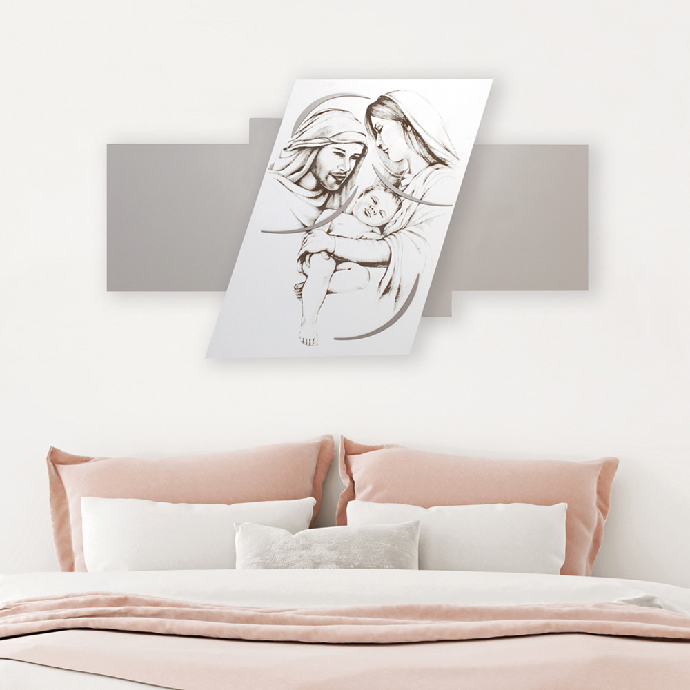 Es stellt die Heilige Familie in Lasermarkierung dar und ist ein Kopfteil mit minimalistischem Design, das sich perfekt für moderne Umgebungen eignet. Lasergravierte, undurchsichtig weiß lackierte Holzplatte auf einer kieselfarbenen Platte mit Kiesverzierungen, die eine religiöse Szene darstellen.