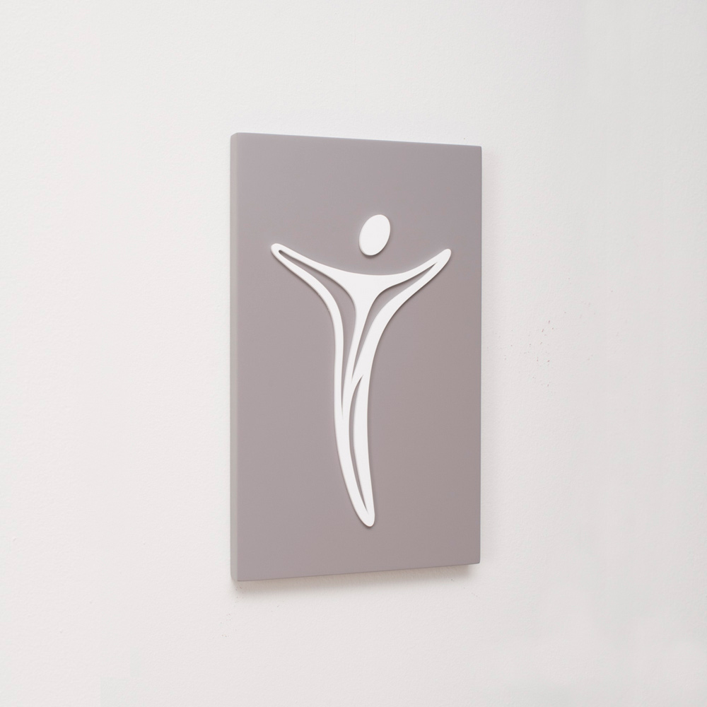 Bild/Kruzifix mit lackiertem Holzsockel und Applikation . Lasergravierte „Kommas“ . Loch zum Aufhängen an der Wand.