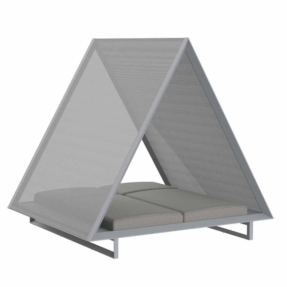 Dieses Tagesbett im Freien ist von einem eleganten Design und grenzenlosem Luxus inspiriert, mit der Idee, eine Zuflucht mit einer traditionellen pyramidenförmigen Architektur zu schaffen.