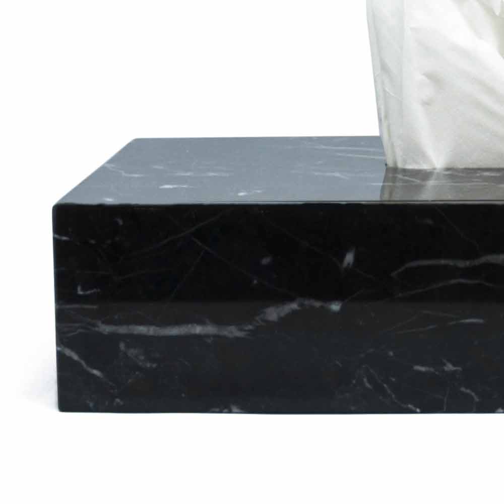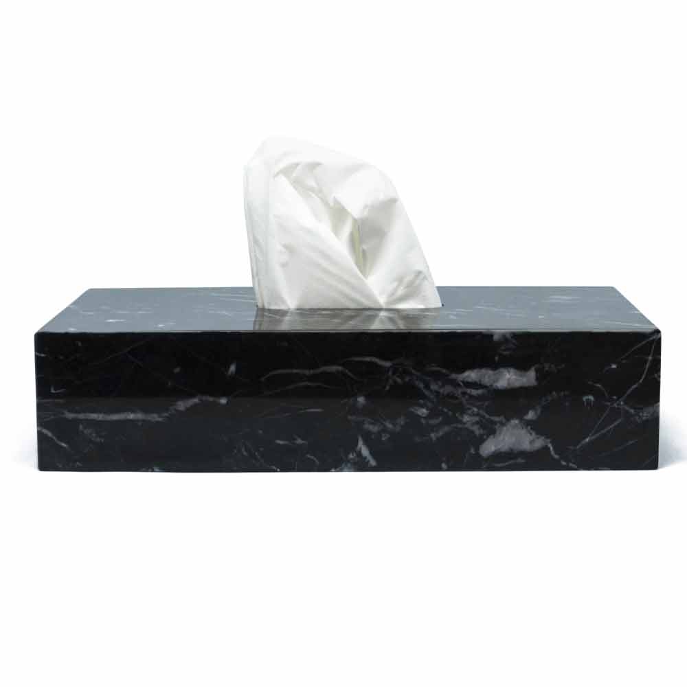 Praktischer Taschentuchhalter , erhältlich in der rechteckigen Version, komplett aus schwarzem Marquinia-Marmor, von spezialisierten Fachleuten handgefertigt. Es ist ein Unikat , da sich jeder verwendete Marmorblock in Bezug auf Maserung und Schattierungen von den anderen unterscheidet.