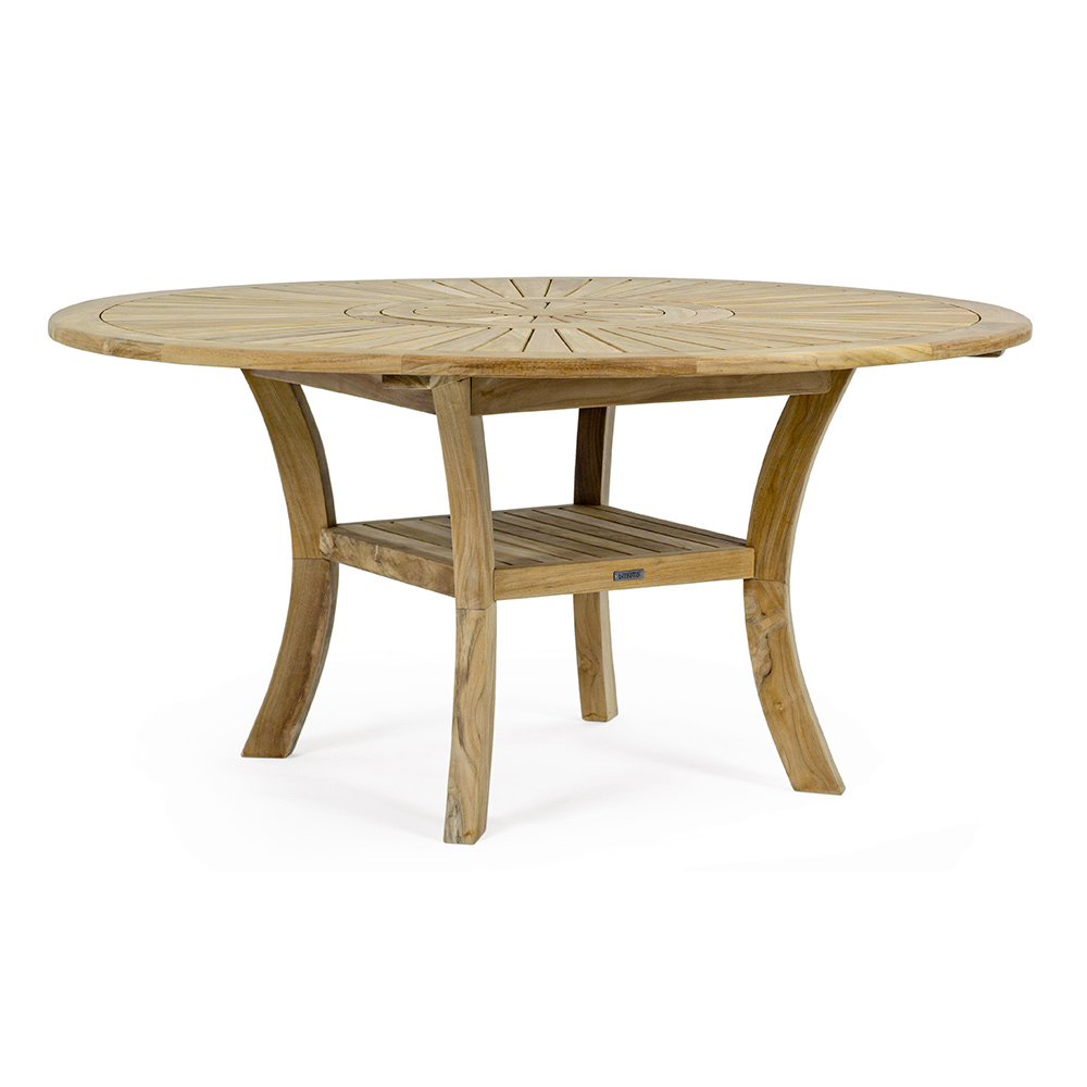 Hochwertiger Esstisch im Freien aus Teakholz mit zentraler Drehplatte.