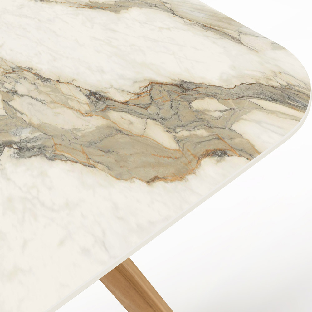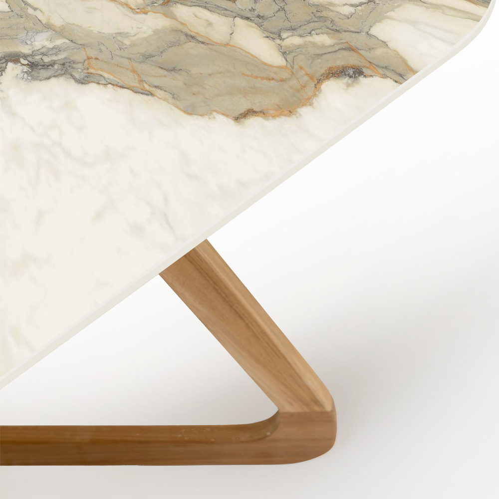 in Italien hergestellt. Dieser Gartentisch ist ein Meisterwerk des Designs, das die Kunst der Keramik mit der Handwerkskunst des Holzes verbindet. Die Keramikplatte ist vom prestigeträchtigen Calacatta Hermitage- Marmor inspiriert, der für seine filigrane graugrüne Maserung auf cremeweißem Hintergrund bekannt ist und jedem Außenbereich einen Hauch von Luxus und Raffinesse verleiht.