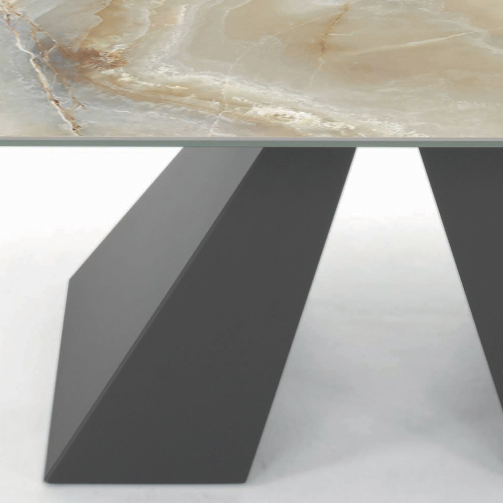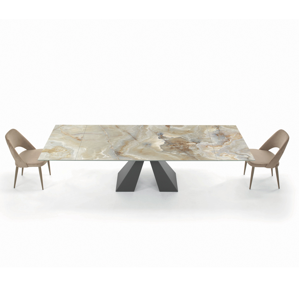 Ausziehbarer Wohnzimmertisch mit integrierten Verlängerungen,Keramikplatte mit glänzend goldenem Onyx-Finish,gerader Kante, Untergestell aus nerzlackiertem Stahl und verstellbaren Füßen. Die italienischen Handwerker , die dieses Produkt geschaffen haben, haben sich der Auswahl der besten Materialien und der Präzision jedes einzelnen Details verschrieben, um dem Kunden einen Tisch zu garantieren, der nicht nur schön, sondern auch funktional und zu verschiedenen Anlässen verwendbar ist. Dieses Element eignet sich perfekt zur Dekoration jeder Alltags- und Objektumgebung und verleiht dem Raum eine einzigartige und elegante Note.