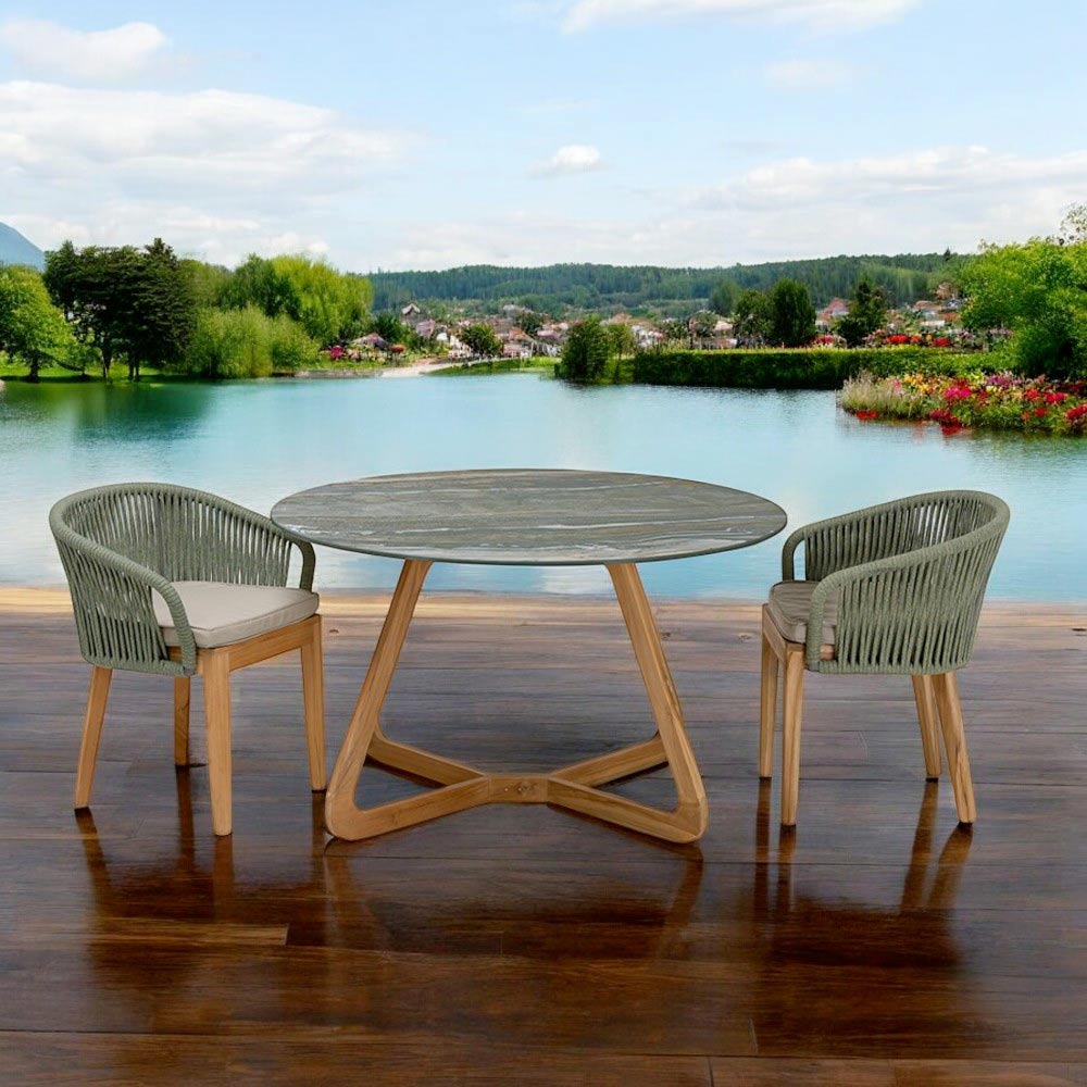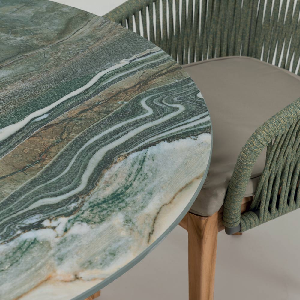 Hier ist ein Esstisch, der zeitlose Eleganz verkörpert, ideal für diejenigen, die einen Hauch von Klasse in den Indoor und Outdoor Raum bringen wollen. Der Tisch mit seiner runden Keramikplatte erinnert an die ruhigen Wellen eines Alpensees und bietet nicht nur eine praktische Oberfläche, sondern auch ein echtes Gesprächsthema. Der Holzsockel sorgt für tadellose Stabilität, kombiniert mit einer skulpturalen Form, die sich organisch und einladend in die Umgebung einfügt. Dieser Esstisch ist die perfekte Wahl für diejenigen Einrichtungsprofis, die Stücke suchen, die die Sprache von Made in Italy , handwerklicher Qualität und Dauerhaftigkeit sprechen. Perfekt für Umgebungen, die Gelassenheit und Gastfreundschaft ausstrahlen sollen, passt es sich mit Vielseitigkeit sowohl an ein einsames Frühstück am frühen Morgen als auch an ein festliches Bankett unter den Sternen an.