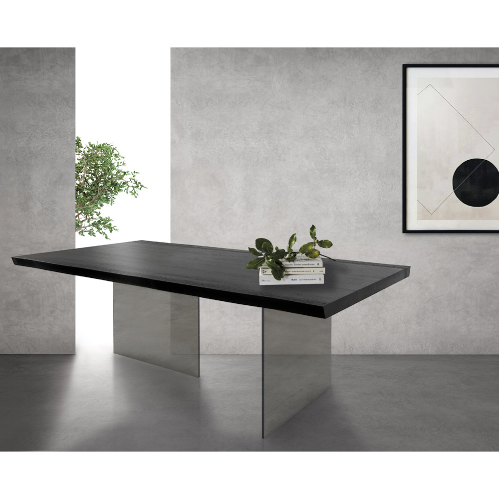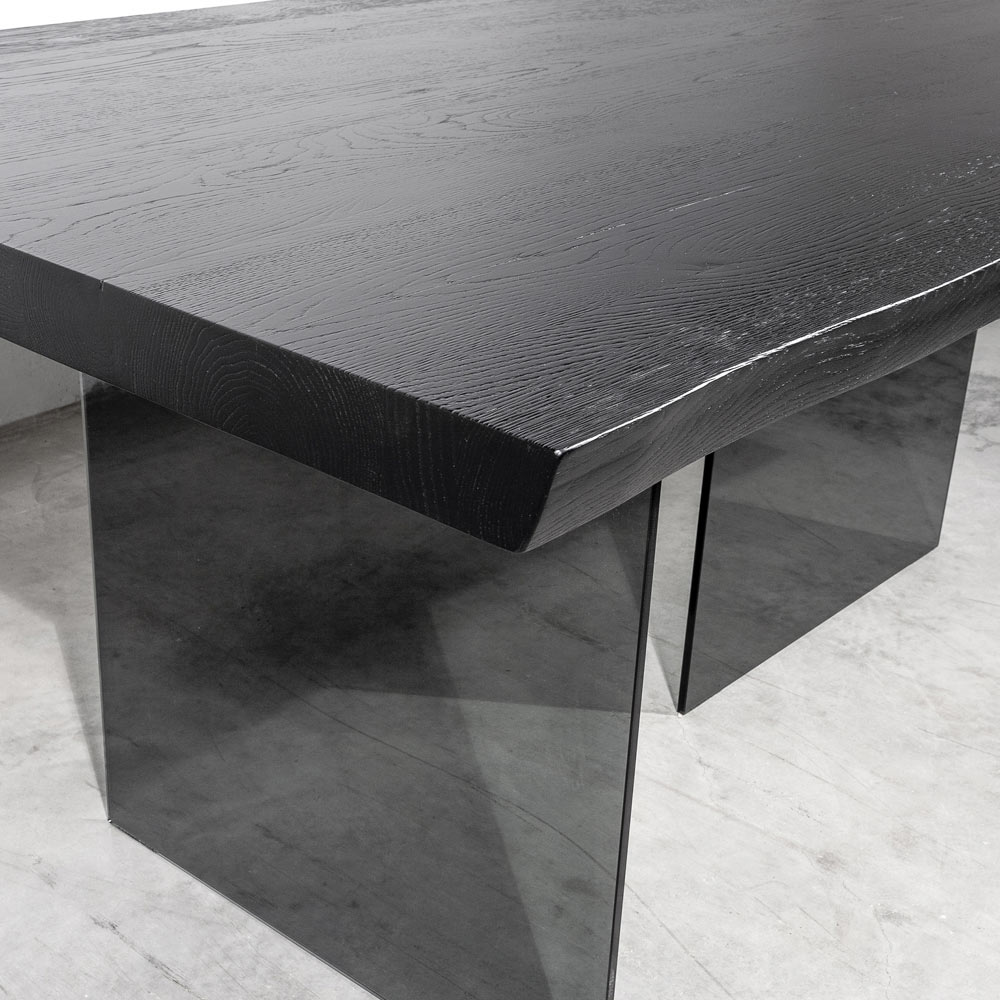 Die Platte dieses Tisches ist mit schultafelfarbener, massiver Asteiche furniert während seine Basis aus Rauchglas ist.