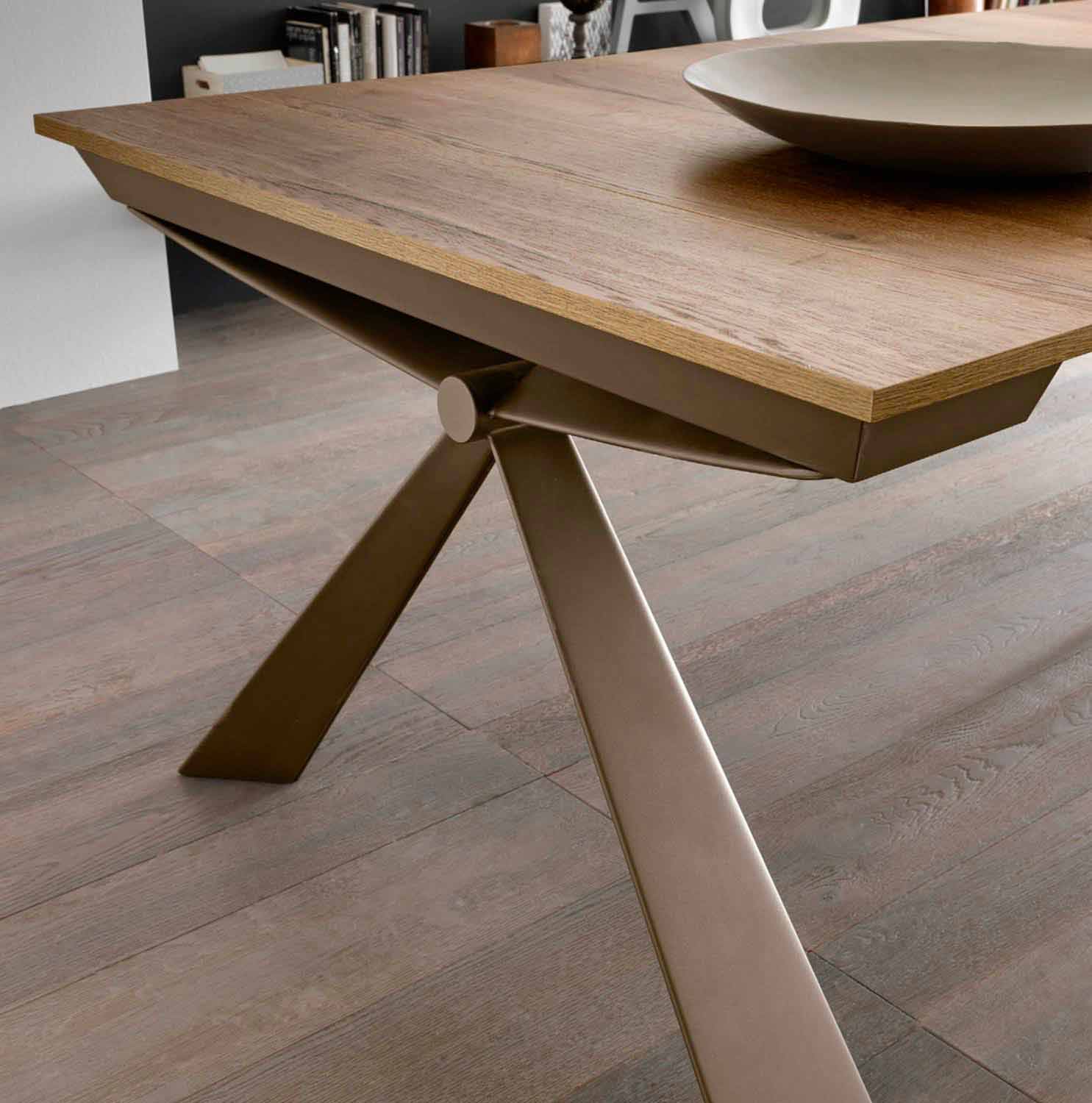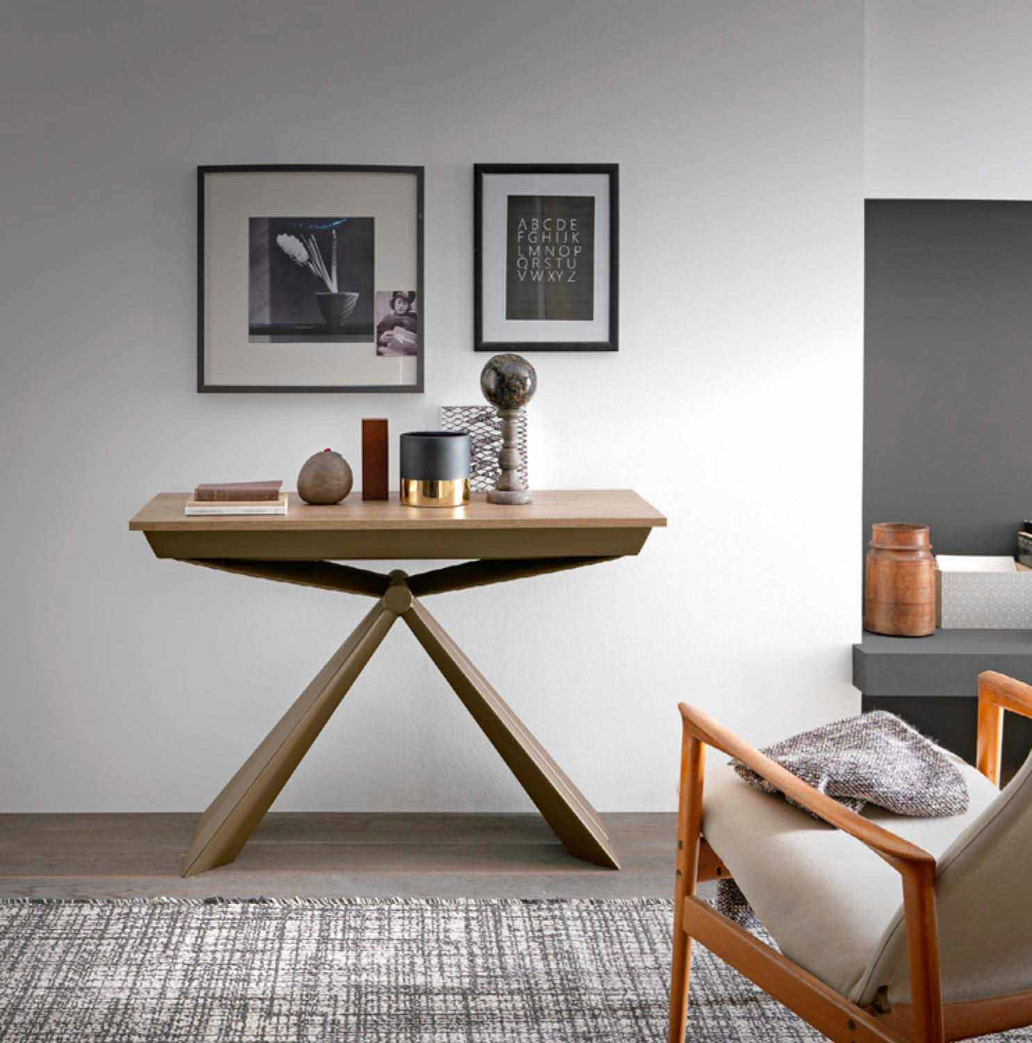 Diese ausziehbare Konsole zeichnet sich durch ein skulpturales Design aus, dank der Form der Metallstruktur, die ihre Linien in einem zentralen Knoten zusammenführt. Das äußerst elegante und symmetrische Ergebnis umfasst den umgebenden Raum in einer umhüllenden szenischen Wirkung.