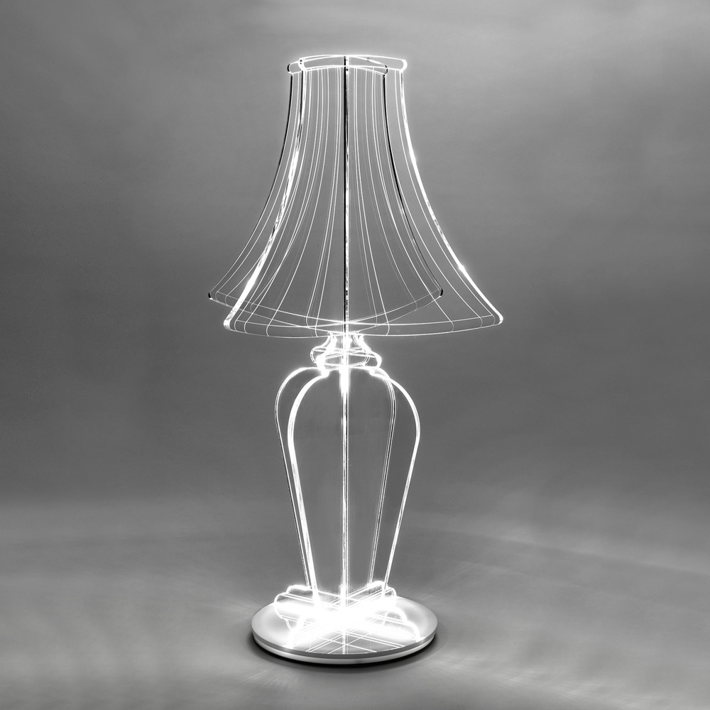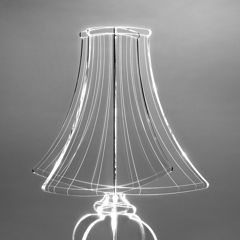 Lassen Sie sich von dieser Lampe verzaubern, einem wahren Designjuwel, das technologische Innovation mit purer ästhetischer Schönheit verbindet. Diese Lampe ist eine Skulptur aus Licht. Das 100 % PMMA-Plexiglas, ausgewählt aus reinen Polymeren, wird sorgfältig mit der Präzision des Laserschneidens gefertigt und zeichnet eine Silhouette, die aufleuchtet und zum Leben erwacht, sobald die Lampe aufleuchtet.