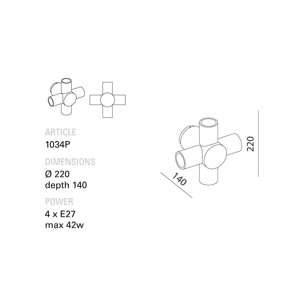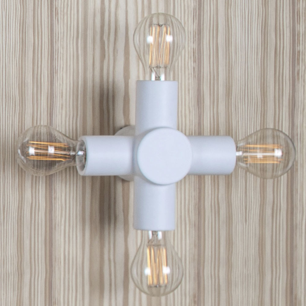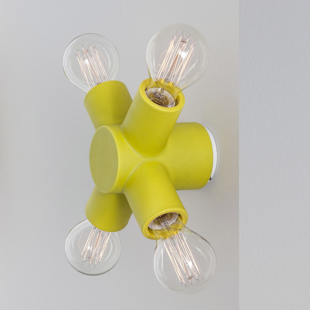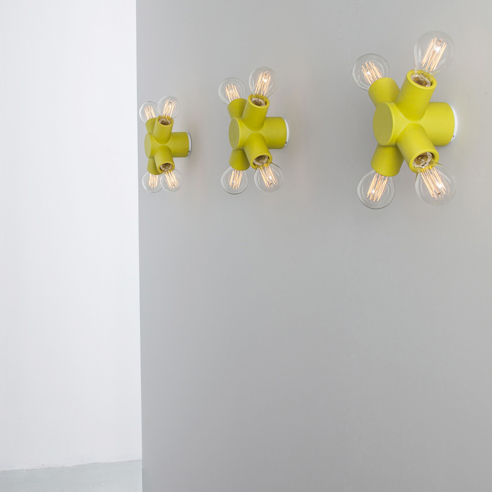 Das Modell besteht aus einem zentralen Zylinder, der den elektrischen Anschluss enthält, von dem weitere seitliche Zylinder in verschiedenen Positionen abzweigen. Es besteht aus gegossener weißer Keramik, ist emailliert und bei über 1000 Grad doppelt gebrannt. Die Metallteile sind in verschiedenen Farben gehalten, darunter Weiß und Orange, inspiriert von den ersten Industrieprodukten der 60er Jahre, oder fluoreszierendes Grün wie die Warnkleidung der Straßenarbeiter.
