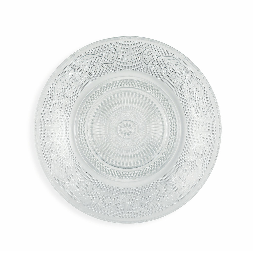 Set aus 18-teilig dekorierten transparenten Glastellern.