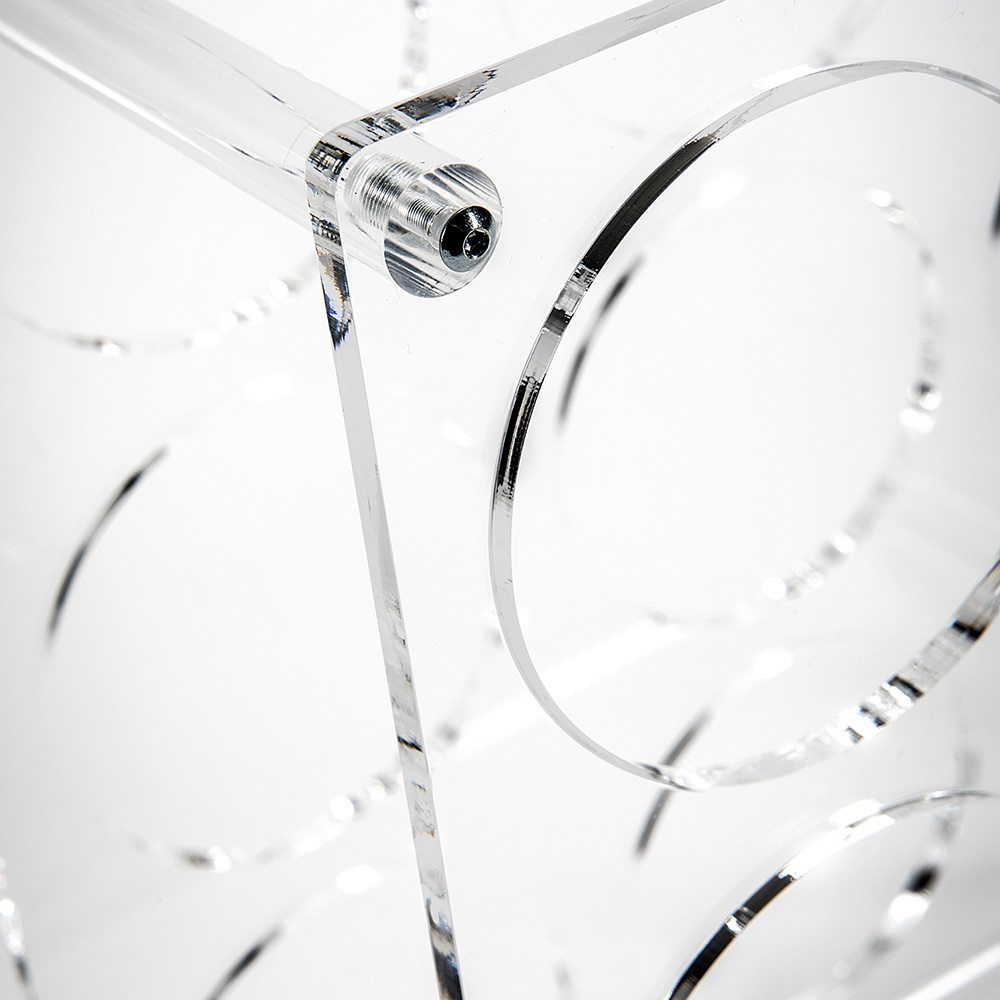 Bodenstehendes Flaschenregal, vollständig in Italien hergestellt , aus PMMA-Plexiglas, 100 % aus reinem Polymer und einem holzigen Essenzblatt, ermöglicht die Aufbewahrung von bis zu 12 Flaschen Wein und Champagner. Es ist praktisch, um Weine und Getränke in Ordnung zu halten, und eignet sich dank seiner funktionalen Ästhetik und seiner originellen Form , die an die Form eines Weinfasses erinnert, perfekt als Designmöbel .