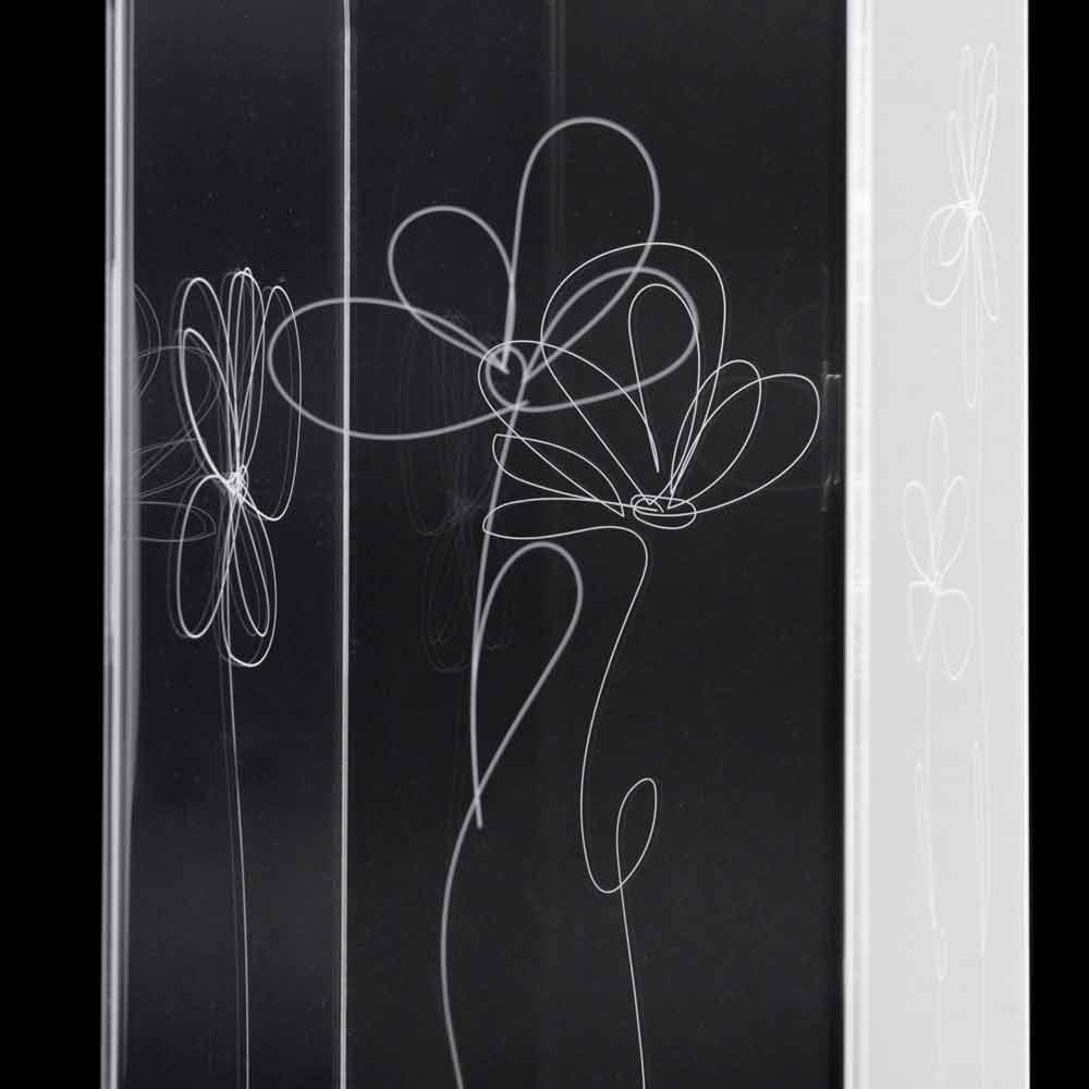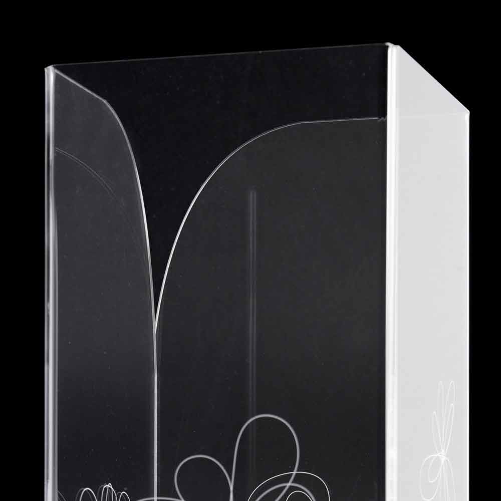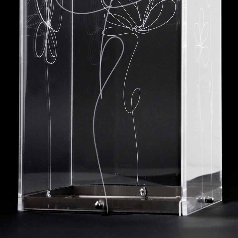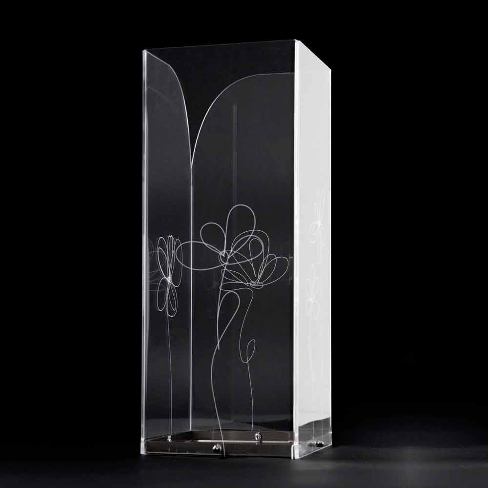 Schirmständer aus transparentem Plexiglas, das sich durch lasermarkierte Blumendekorationen im stilisierten Stil mit Edelstahlsockel auszeichnet.