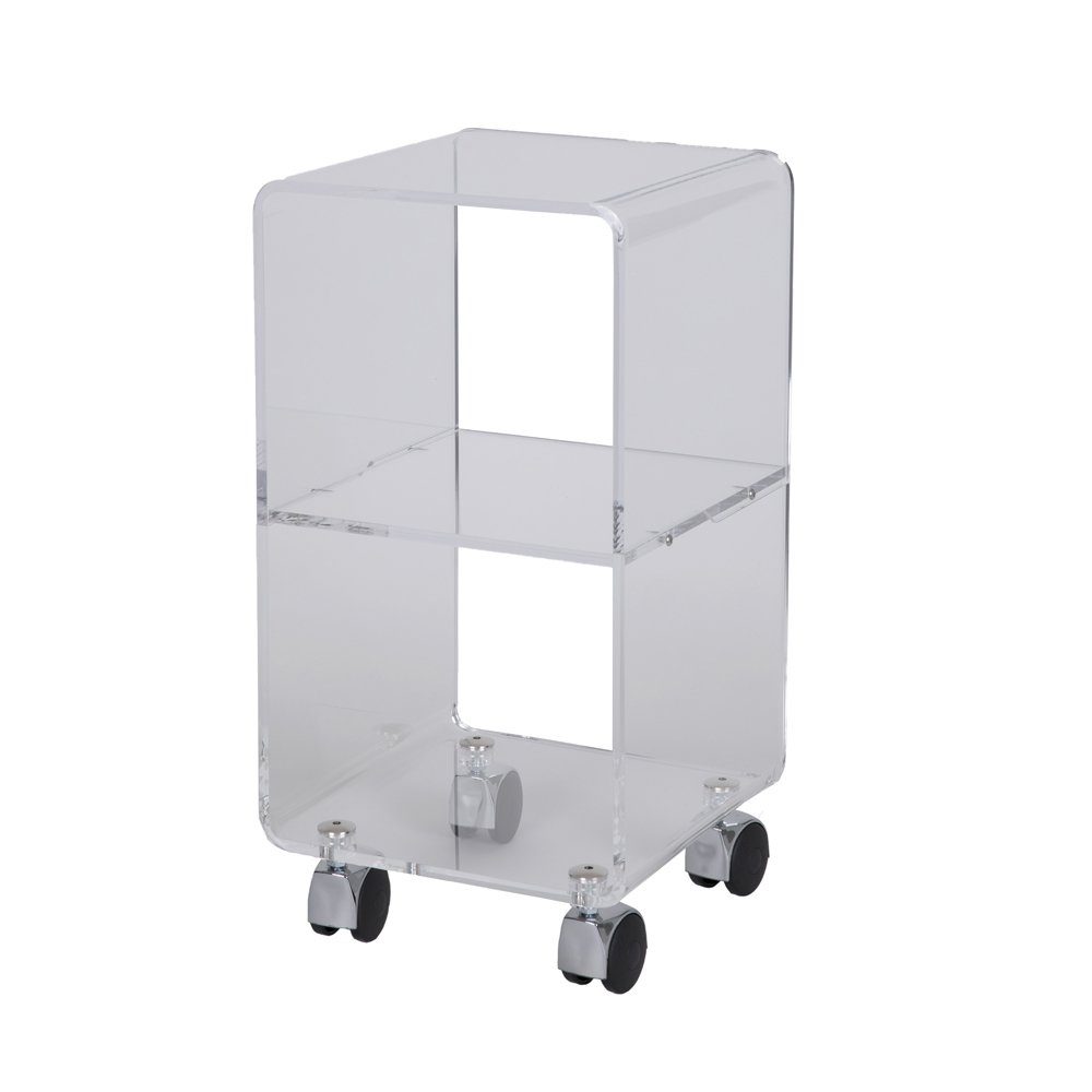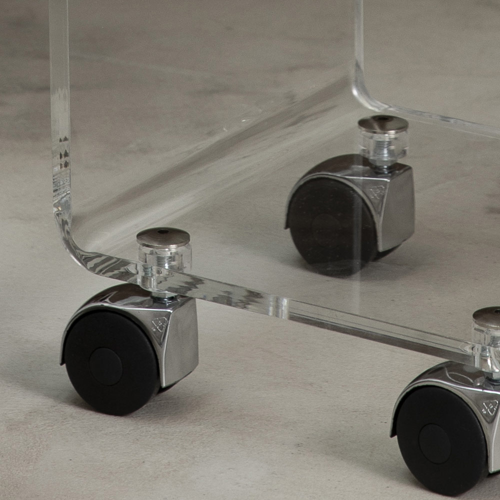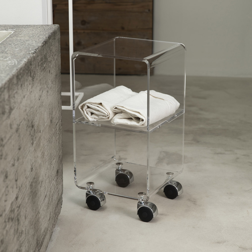 Säulenwagen aus transparentem Acrylglas mit Rädern und 1 oder 3 Regalen, hergestellt in Italien.