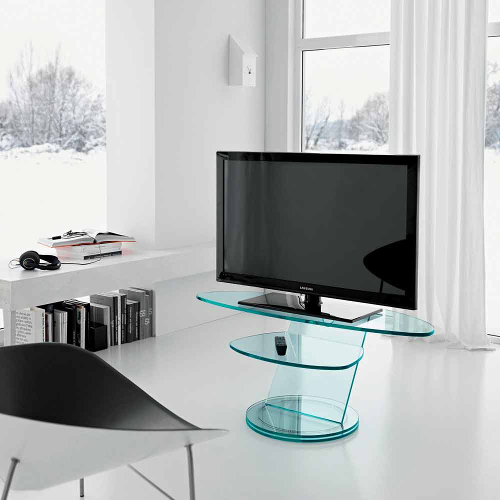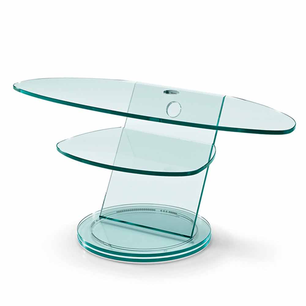 Bestehend aus einer elliptischen TV-Platte und einem unteren Regal, ist das besondere Merkmal die drehbare Basis, die über ein patentiertes System von Stahlkugeln verfügt , die es ermöglichen, die Fundamente zu drehen , für maximales Design und Funktionalität.