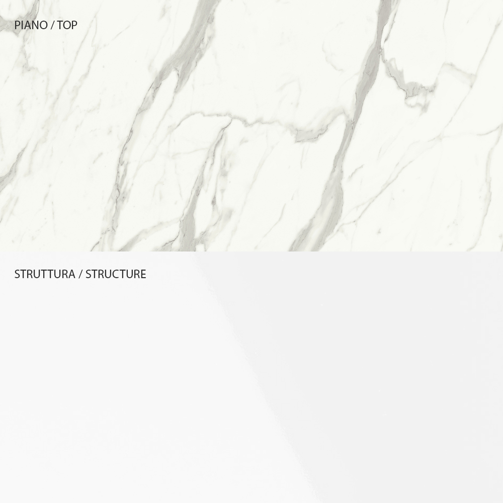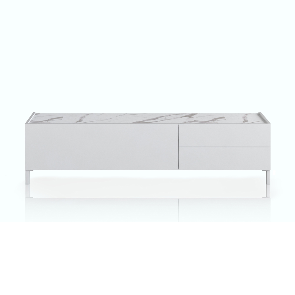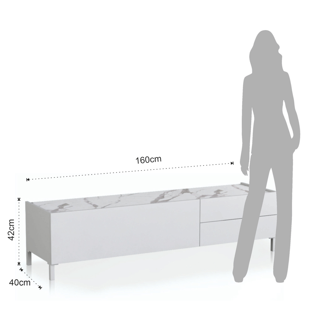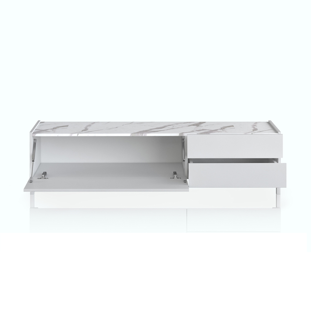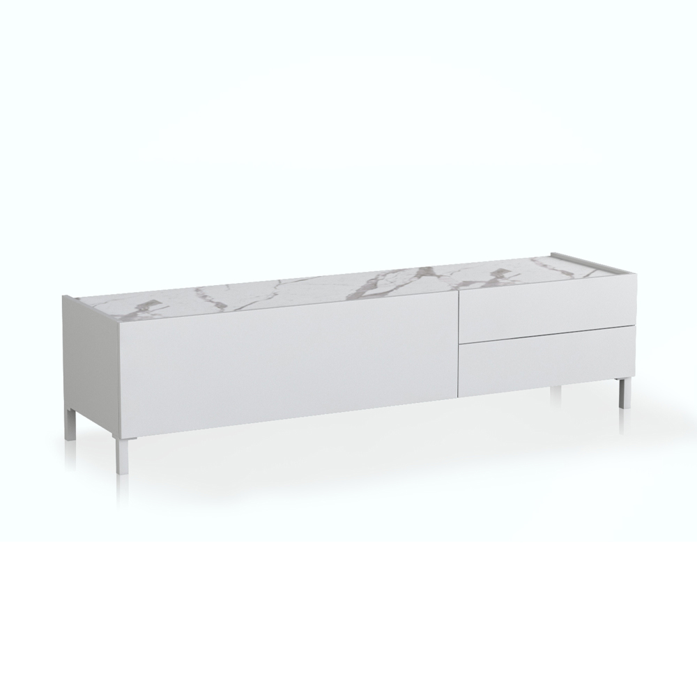 TV-Schrank aus ökologischen Holzspanplatten mit einer Stärke von 15/16 mm, glänzend weiß lackiert , Platte mit Melaminbeschichtung in Calacatta-Marmor-Optik , mit 1 Klapptür, 2 Schubladen und verstellbaren Füßen , komplett . Dank seiner Verarbeitung eignet sich dieses Möbelstück perfekt zur Vervollständigung der Einrichtung jedes Wohn- und Aufenthaltsraums. Dank der Türen und Schubladen bietet er viel Fassungsvermögen und Platz für die Aufbewahrung von Gegenständen, sodass diese stets ordentlich und griffbereit sind.