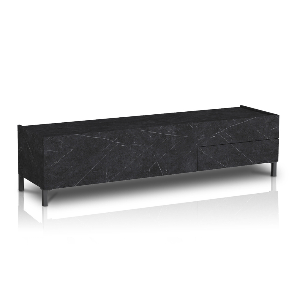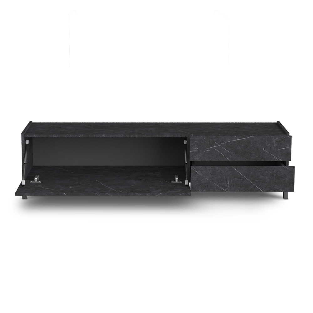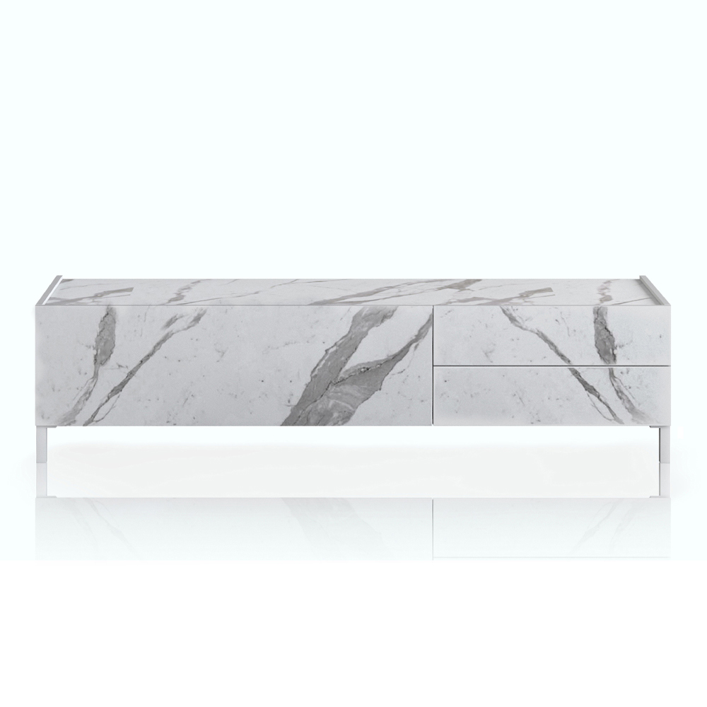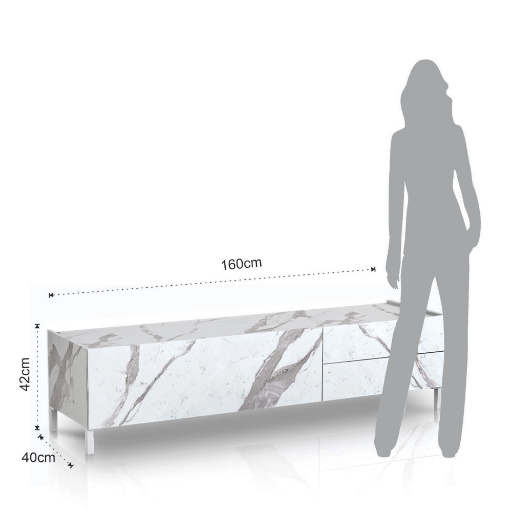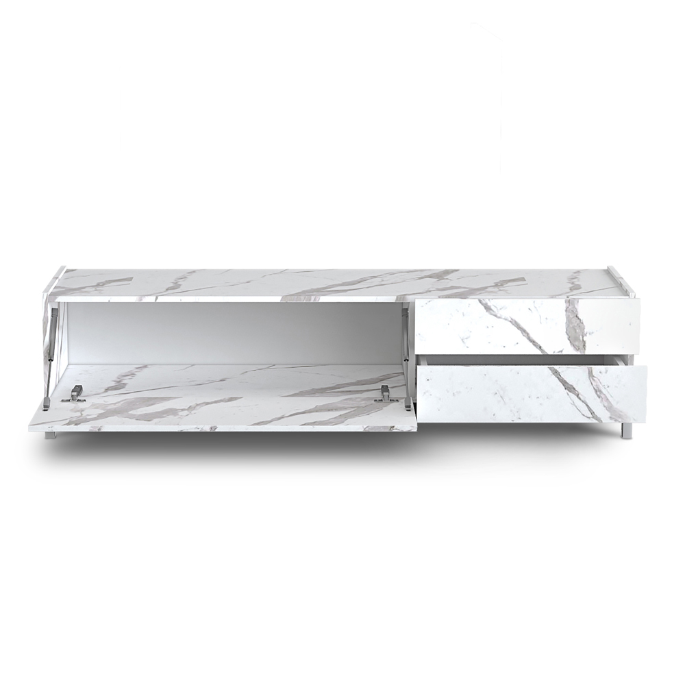 TV-Schrank aus ökologischen Holzspanplatten mit einer Dicke von 15/16 mm, vollständig mit Melamin mit mattem Calacatta-Weiß-Marmor-Finish überzogen, mit 1 Falttür, 2 Schubladen und verstellbaren Füßen , komplett . Dank seiner Verarbeitung eignet sich dieses Möbelstück perfekt zur Vervollständigung der Einrichtung jedes Wohn- und Aufenthaltsraums. Er bietet großes Fassungsvermögen und Platz für die Aufbewahrung von Gegenständen, sodass diese dank der Tür und der Schubladen immer ordentlich und griffbereit sind.