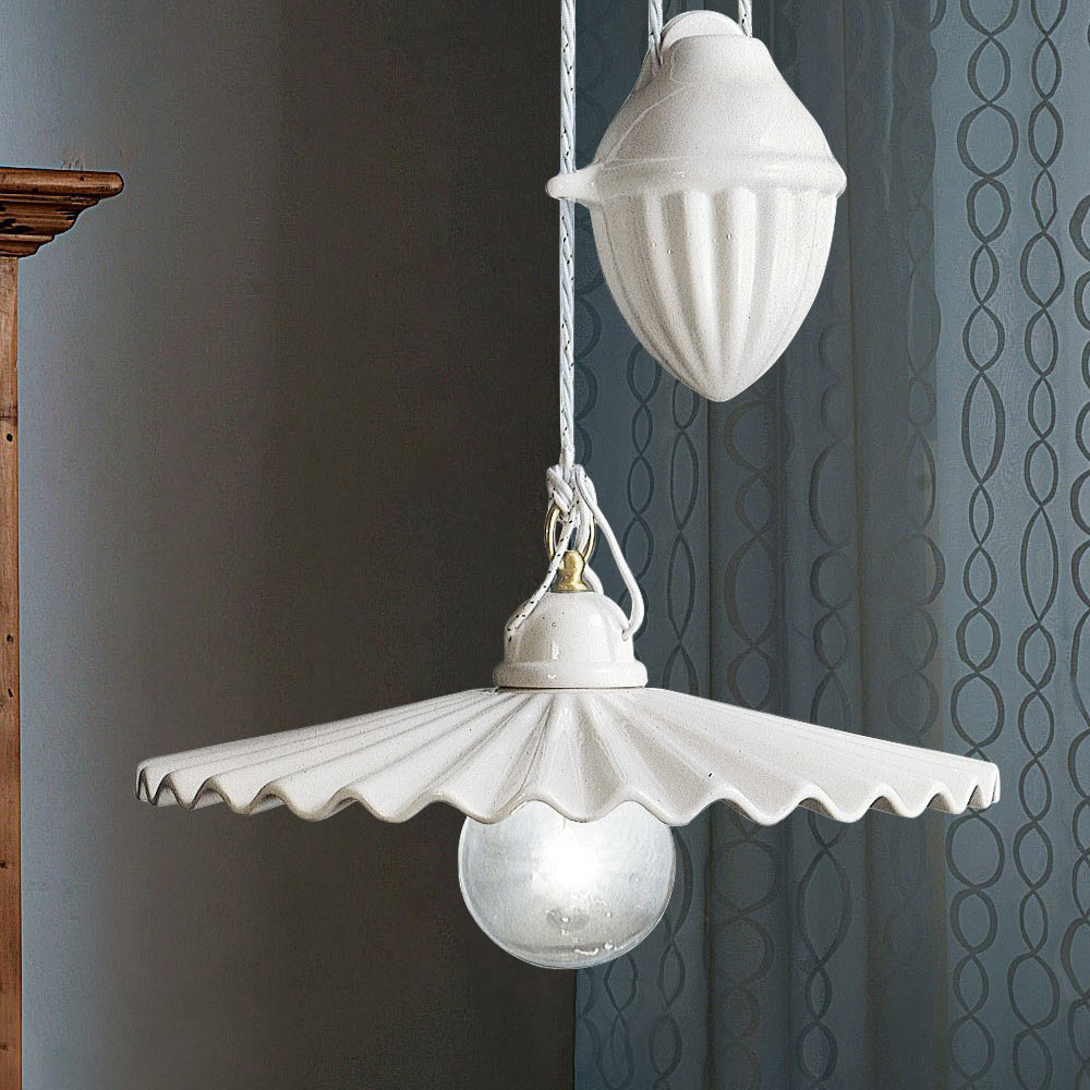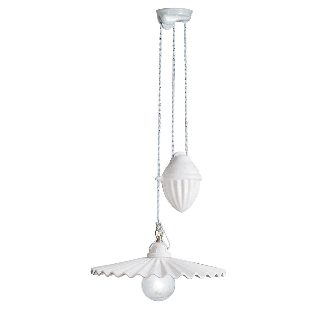 Die Pendelleuchte mit Gleitschiene ist vollständig aus plissierter glänzender Keramik gefertigt die die Handwerkskunst und Geschicklichkeit der Handwerker hervorhebt.