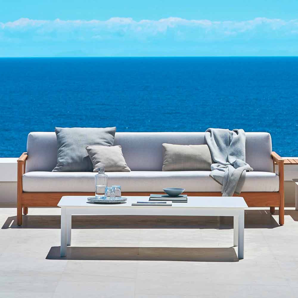 Bali ist ein wunderbares dreisitziges Outdoor-Sofa, das sich durch eine tragende Struktur aus massivem Teakholz von zertifizierten Plantagen und Sitzen und Rückenlehnen auszeichnet, die mit Stoff bezogen und mit Dryfeel-Gummi gepolstert sind.