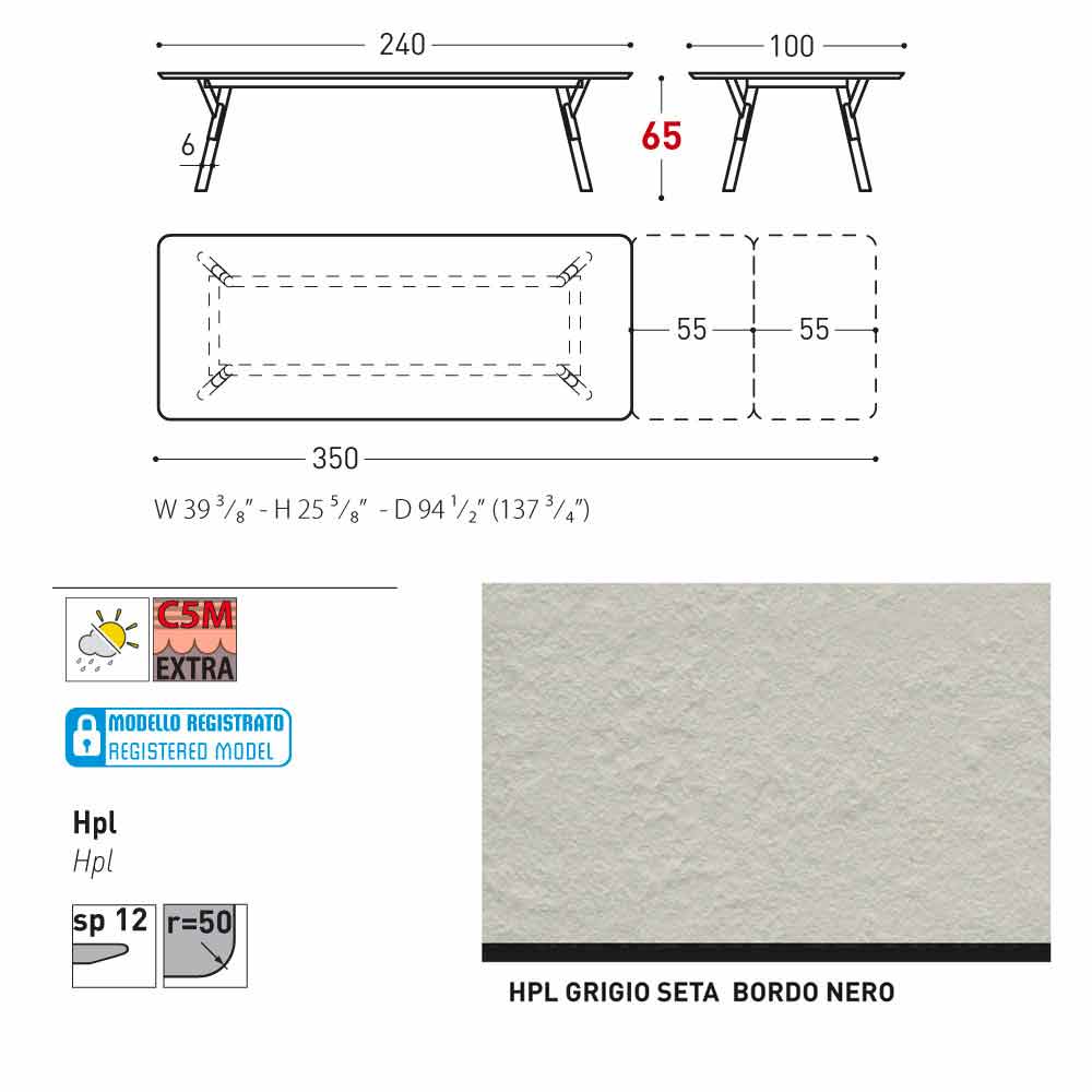 HPL Charaktereigenschaften: HPL heißt High Pressure Laminate. Diese Laminate bestehen aus mehreren Schichten Papier 70% mit einer 30% igen Harz Beschichtung, die unter hohem Druck zusammengefügt wurden.  HPL-Platte (auf Basis thermohärtender Harze, homogen verstärkt mit Holzfasern, unter hohem Druck und Temperatur verpresst, der Pressvorgang dauert ca. 40 - 45 min). Das Ergebnis ist eine kompakte feste Tischplatte resistenter als je zuvor, die sowohl im Innenbereich, im Außenberich als auch im Marinebereich anewendet werden kann.
