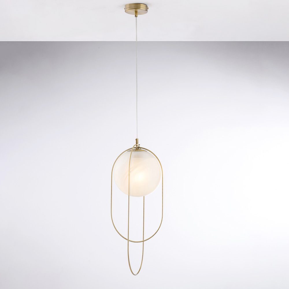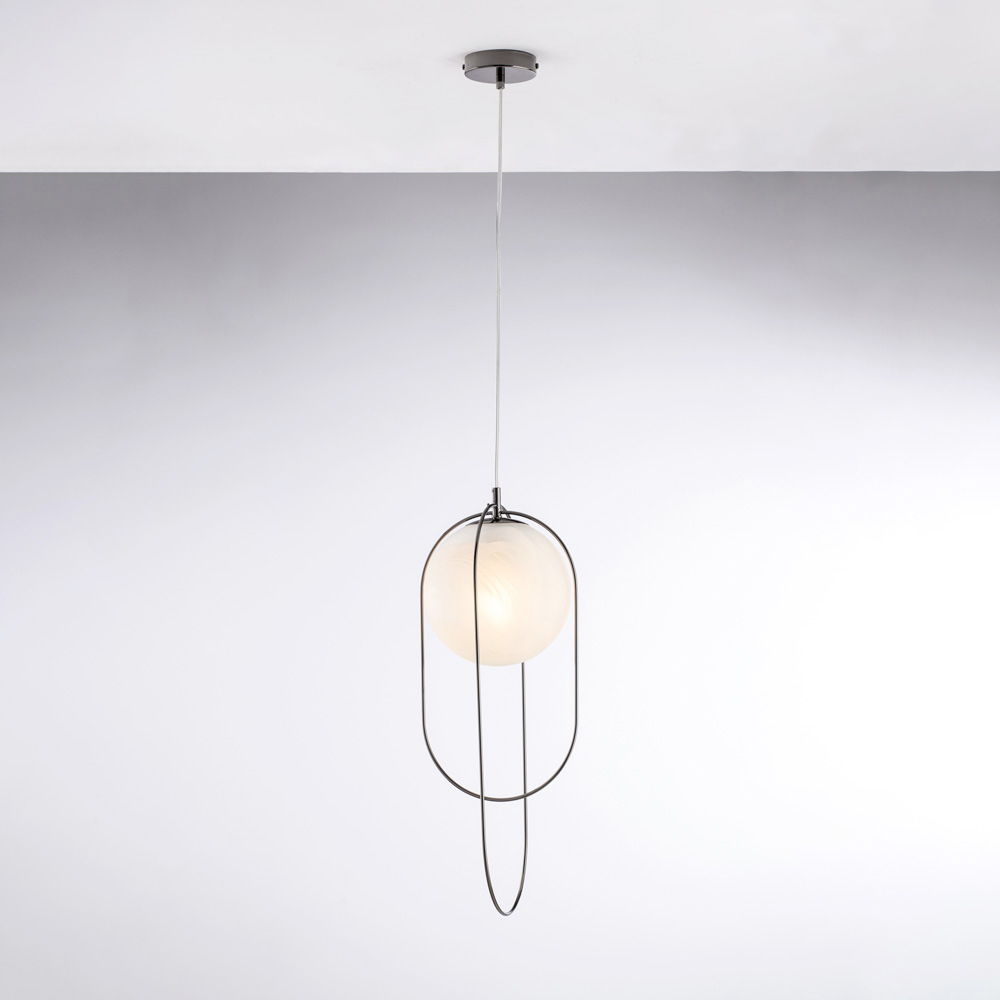 Diese schlichte und zugleich elegante Designer-Pendelleuchte aus Eisen mit Glaskugel ist eine moderne Beleuchtungslösung für alle, die klare Linien und dezente Eleganz schätzen. Die schlanke Metallstruktur umschließt eine leuchtende Kugel mit 20 cm Durchmesser und schafft so ein harmonisches Zusammenspiel von Form und Licht.