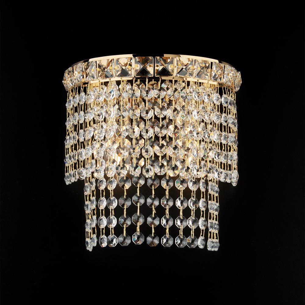 Elegant und faszinierend zugleich: Diese luxuriöse Wandleuchte aus Eisen und vergoldetem Messing mit Strasssteinen ist ein raffiniertes Beleuchtungselement, das Wände in ein warmes, einladendes Licht taucht. Die kompakte, mit leuchtenden Strasssteinen besetzte Struktur erzeugt ein faszinierendes Lichtspiel, das dem Raum eine elegante und charmante Atmosphäre verleiht.