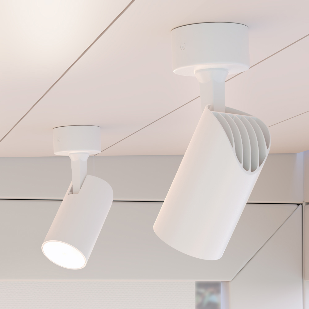Innenstrahler aus weißem oder schwarzem Aluminium mit 90° verstellbarer und 355° verstellbarer Struktur. Ein besonders vielseitiger Kleinprojektor, der sich leicht an verschiedene Wohn-, Gewerbe- und Objektbereiche wie Shops, Showrooms, Ausstellungsbereiche aber auch Restaurants und vieles mehr anpassen lässt Beleuchtung .
