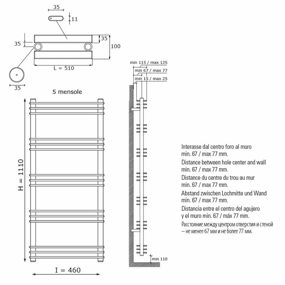 Maße H 1110 x L 510 x P 35 x Inter. 460 mm x Ausgang w (Δt50 *) 530