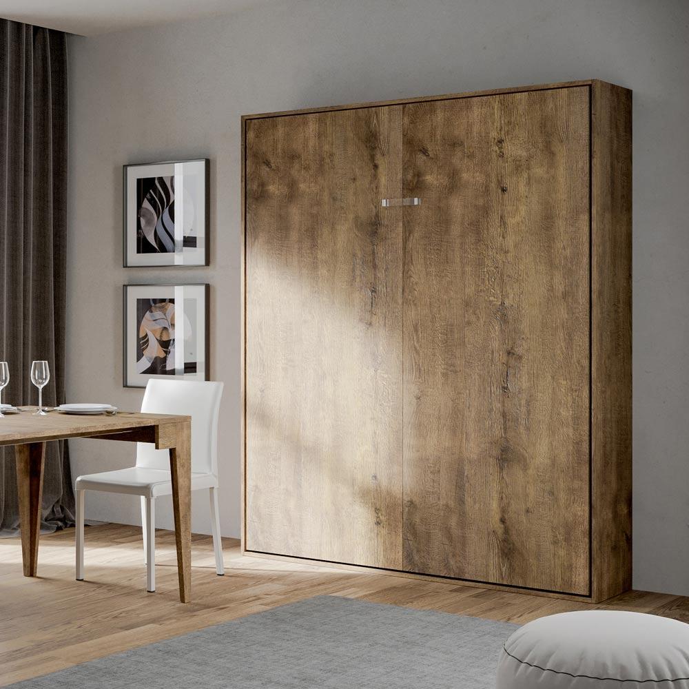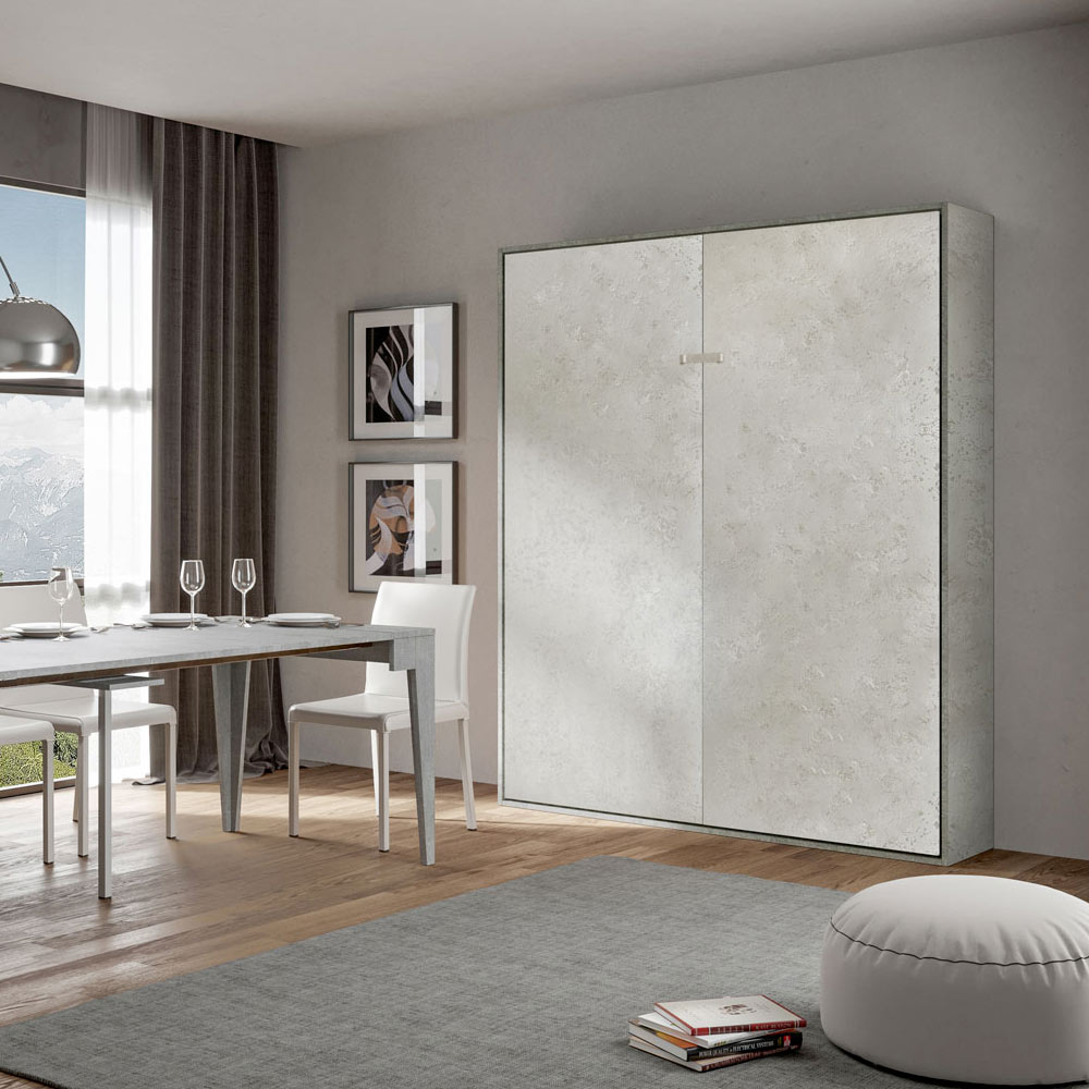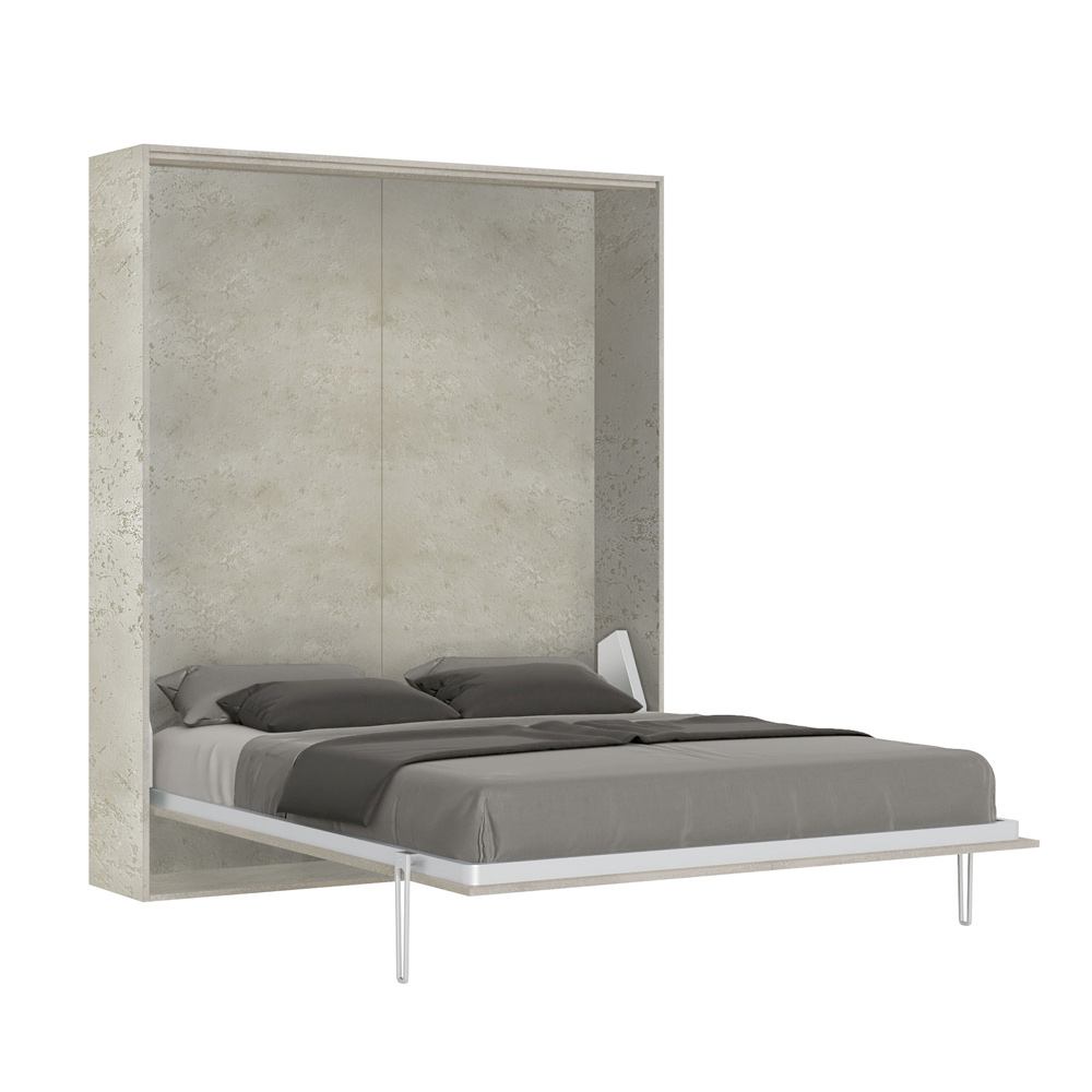 Der Bettrahmen besteht aus 18 mm dicken Melamin-Spanplatten und gewährleistet so Widerstandsfähigkeit und Langlebigkeit. Der Öffnungsmechanismus ist sanft und sicher und verwandelt die Wand mit einer einfachen Geste in ein bequemes Bett.