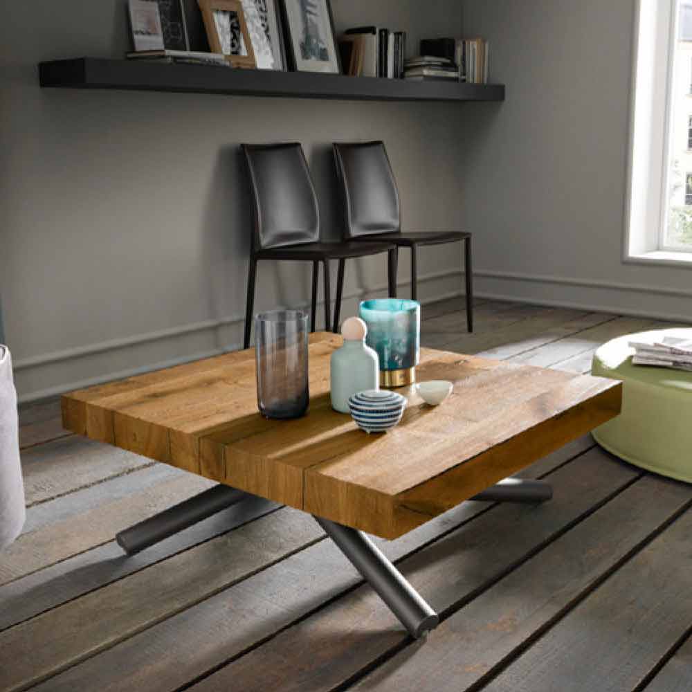 verwandelbare Couchtisch kombiniert die Modernität des Konzepts und das verflochtene Design der Metallbeine mit dem naturalistischeren und wertvolleren Teil der dicken (8 cm) Tischplatte aus massiver Eiche.