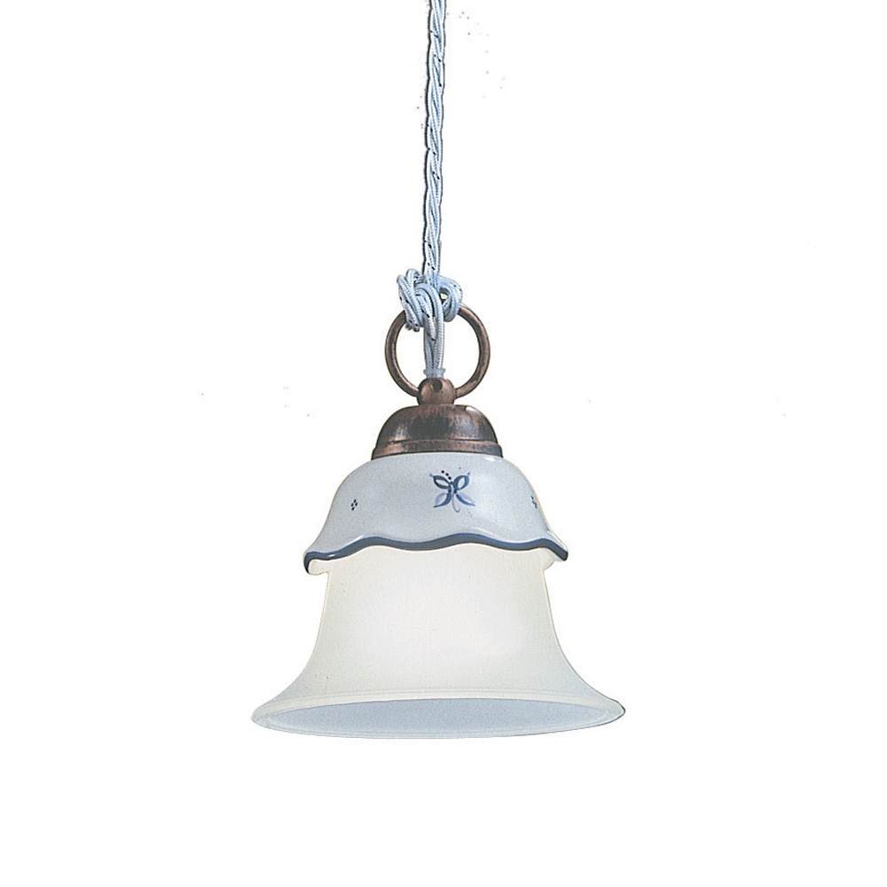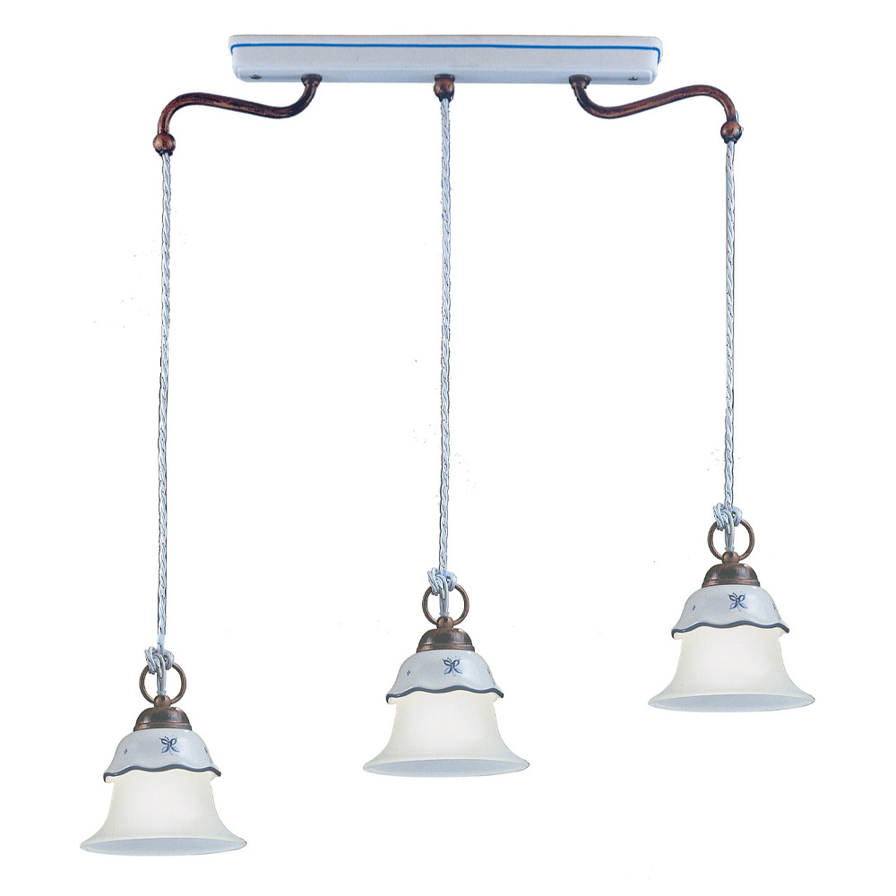 Pendelleuchte 3 Lichter aus Eisen, handverzierter Keramik und säuregeätztem Glas, hergestellt in Italien von Ferroluce.