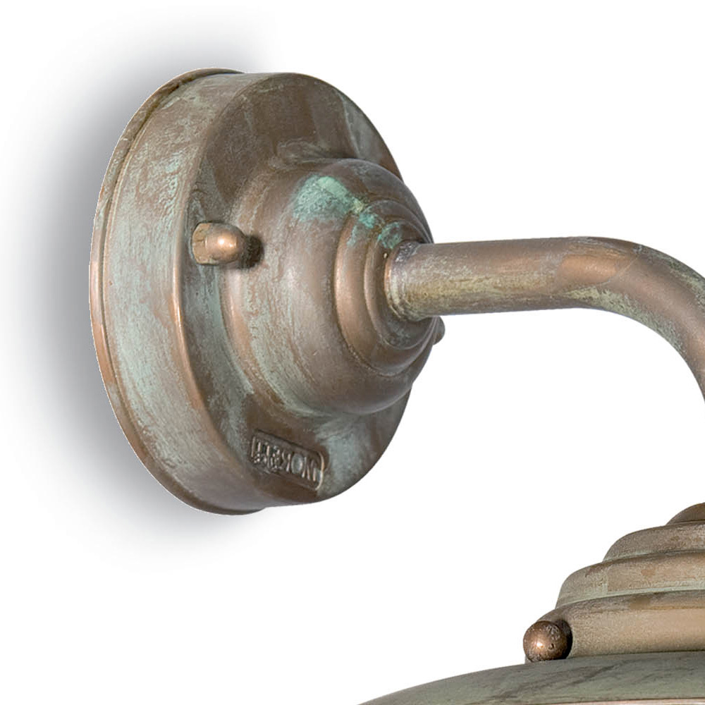 Diese authentische und zeitlose Außenwandleuchte erinnert an den Charme traditioneller Laternen und interpretiert ihn elegant neu. Die handgefertigte Messingstruktur besticht durch ihre antike Oberfläche , die die Materialität des Metalls hervorhebt und einen edlen, wohnlichen Look verleiht.