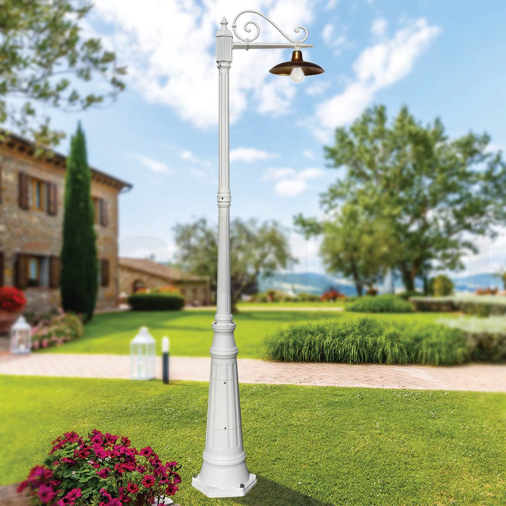 Außenlaterne mit Struktur aus geprägtem weißem Aluminiumdruckguss und Diffusor aus natürlichem Messing (Durchmesser 260 mm), vollständig in Italien hergestellt . Komplett mit Edelstahlschrauben und Silikondichtung für besseren Schutz. Ein Design, das sich durch lineare Formen und Merkmale auszeichnet, die sich durch Wesentlichkeit und Funktionalität auszeichnen, Elemente, die es zu einem Produkt mit ausgeprägter Vielseitigkeit machen. Die perfekte Kombination der angebotenen Oberflächen und Materialien unterstreicht die Eleganz des Produkts und seine Vintage-Seele . Ideal für Außenbereiche wie Gärten, Innenhöfe, Alleen und Gehwege, aber auch für gewerbliche Räume wie Bars und Restaurants.